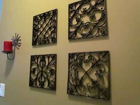 С помощью этих квадратов, я начал, разделив его на четыре равные части, а затем создание той же схеме в каждой части. Я просто создал, как я пошел и использовать конце кисти делать какие-либо завитков необходимости.Как только они были завершены и сухой, я затем спрей рисовал их краской металл-вид. Если вы лично и близко и даже дотрагиваться до них, они выглядят совершенно как металл. Но не стоить почти цене.