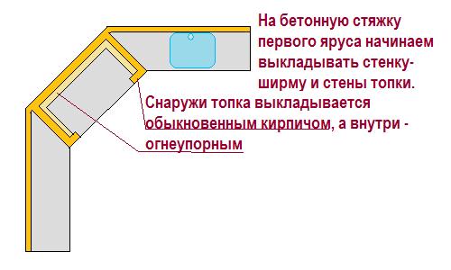 Второй ярус в нашем случае состоит из топки и стенок, которые служат ширмой от просмотра с улицы. На стенках не буду останавливаться подробнее, в этом нет ничего сложного – обыкновенная стенка в полкирпича (которая вам может не пригодиться). А вот о топке поговорим подробнее.