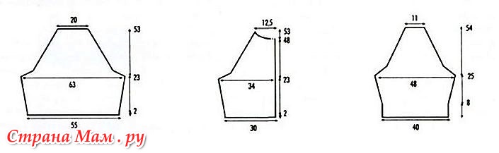 Спинка: на спицы № 3,5 набрать 110 п. Вязать резинкой 2х2, начиная и заканчивая 2 лиц. п. На высоте 2 см продолжить лицевой гладью. Прибавить с обеих сторон в каждом 6-м р. 8 раз по 1 п. = 126 п. Для пройм на высоте 23 см закрыть с обеих сторон в начале каждого р. 5 п., 4 п., 3 п., 2 п. и 1 п. и продолжить убавление петель (см. выше) с обеих сторон в каждом лиц. р. 28 раз по 1 п. Для выреза горловины на высоте 53 см закрыть оставшиеся 40 п.