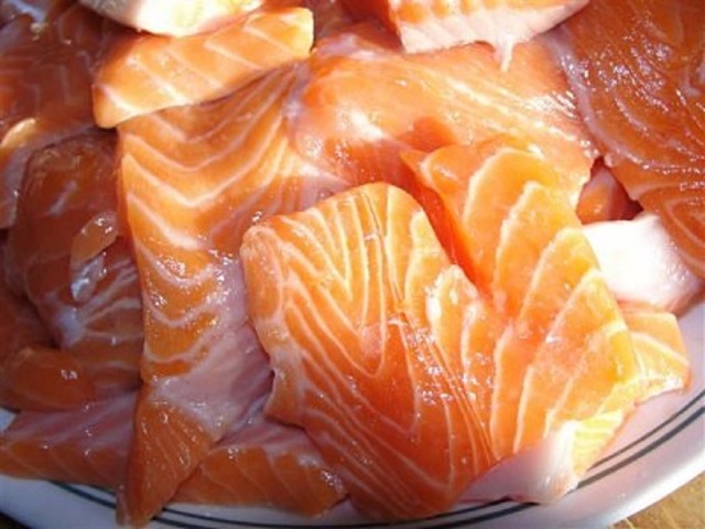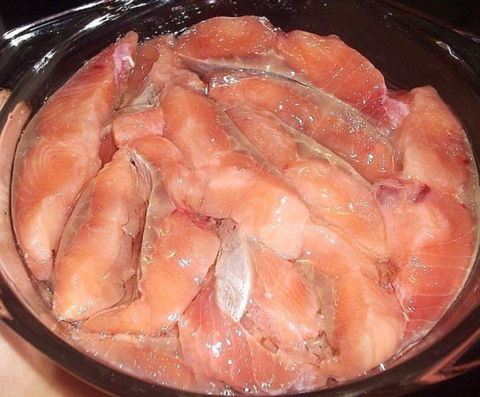 Как известно, горбуша - рыба довольно суховатая и постная. Но при таком способе засолки превращается в благородную семгу. Нежная, сочная! Готовится очень быстро и можно дегустировать уже через час. Понадобится филе горбуши, порезанной на ломтики. Если рыба мороженая, размораживать не надо. Мороженую рыбу резать легче - кусочки получаются аккуратнее Сделать солевой раствор с холодной кипячёной водой, очень насыщенный. На 1л. 4 - 5 ст.л. соли Если очищенный картофель всплывёт в растворе - готово. Рыбу положить на 5-8 минут в раствор. Затем вынуть, промыть, просушить немного салфеткой. Положить слоями в подходящую посуду, полить маслом подсолнечным без запаха. Поставить на 30-40 минут в холодильник. Подавать с луком, лимоном, зеленью.
