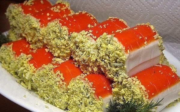 ИНГРЕДИЕНТЫ: ● крабовые палочки - 1 упаковка (200 г), ● яйца - 3-4 шт, ● сыр - 70-100 г, ● чеснок - 1-3 зубчика, ● майонез, ● укроп ПРИГОТОВЛЕНИЕ: Яйца отварить. Белки аккуратно отделить от желтков и натереть в разные миски на терке (белки натереть на крупной терке, а желтки на мелкой). Сыр натереть на мелкой терке.Чеснок пропустить через пресс. Укроп мелко порубить. Соединить яичные белки, сыр, чеснок, укроп, заправить массу майонезом и хорошо перемешать. Крабовые палочки аккуратно развернуть. Каждую палочку смазать яично-сырной массой и аккуратно, но довольно плотно, свернуть в трубочку так, чтобы начинка была внутри. Для удобства употребления, палочку разрезать пополам на два небольших рулетика. Каждую палочку с торцевых сторон смазать майонезом и обмакнуть в тертые желтки, чтобы получилась красивая опушка. Выложить на блюдо, немного посыпать сверху желтками и украсить зеленью укропа.