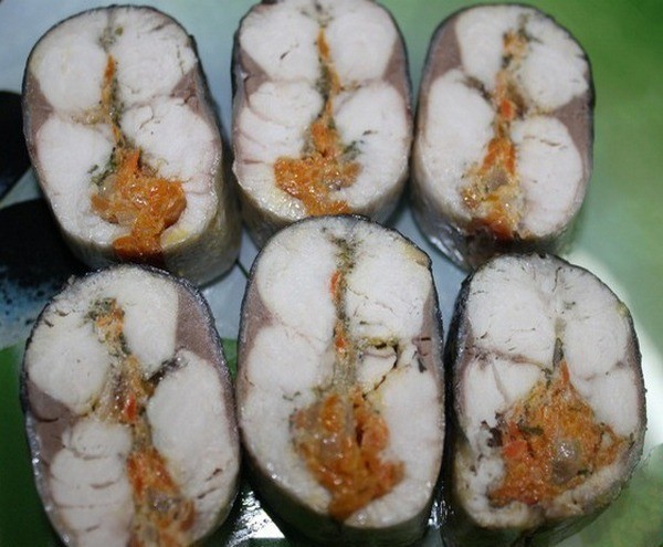 Ингредиенты:Скумбрия—2 шт Морковь—2 шт Лук репчатый(головки) —2 шт Укроп—1 пуч. Желатин—2 ст. л. Соль (+ перец, по вкусу) Рецепт "Скумбрия фаршированная": Итак, приступим. Скумбрию разделать, промыть, тщательно освободить от костей и разрезать вдоль. Посолить, поперчить... Укроп порезать и посыпать хорошим слоем нашу рыбку. Лук мелко порезать, морковь натереть на тёрке... Всё пережарить, остудить и выложить на одну половинку по всей длине. Вторую половинку посыпаем 1 ст. лож. желатина (прямо как есть - сухим)... Соединить две половинки. Плотно завернуть в пищевую пленку в несколько слоев. Вот такие "мумии" положить в кипящую воду и варить 30 минут. Вытащить и положить под пресс! (на тарелочку рыбку прям в пленке, не разворачивая, сверху разделочную доску и что-нибудь тяжеленькое). Как остынет, поместить в холодильник часа на 3. После чего можно нарезать на кусочки и подавать на стол (маленький совет: нарезайте прямо в плёнке, кусочки будут ровненькие и не будут разваливаться!) Кушайте! Вкусно!