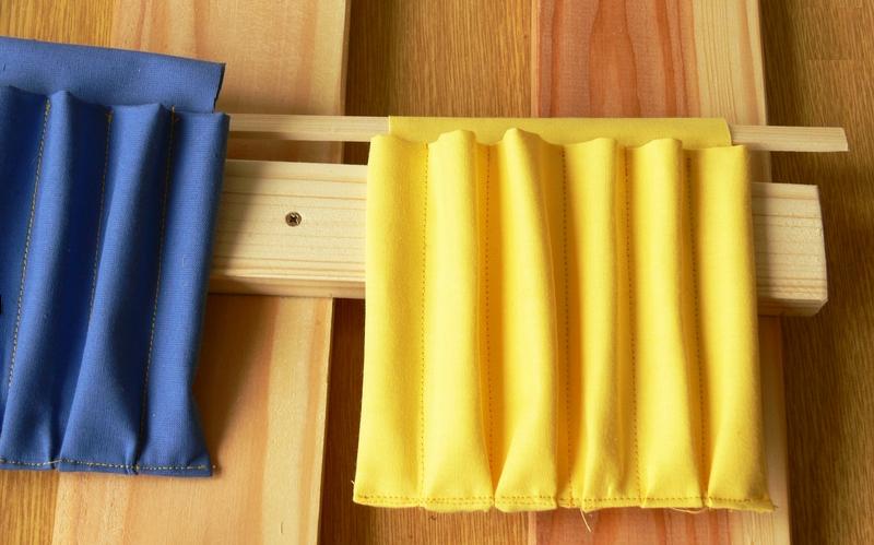 9. Переднюю сторону кармашков пришьем на 2 см ниже верха задней стороны. Прошьем посередине, потом сровняем кармашки по бокам и тоже прошьем. Нижний край сошьем, подвернем на обратную сторону и еще раз прошьем. Наконец кармашки наденем на планку.