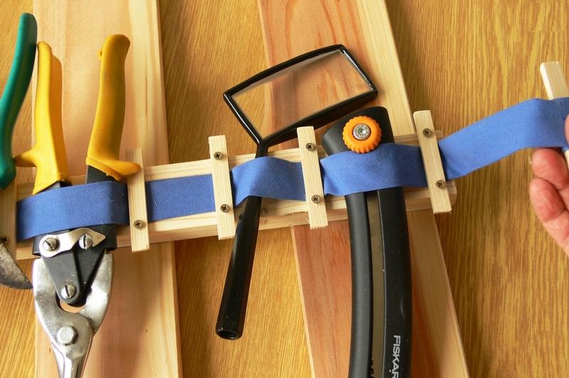 7. Винты не затягивать сильно, чтобы передвижной пояс можно было вытянуть или ослабить при необходимости. Расстояния между разделяющими планками можно делать разное, потому что будем туда убирать инструменты разного размера.