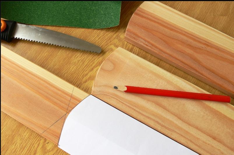 1. Основа для кармашков состоит из трех деревянных дощечек длиной 60 см, шириной 8,5 см и толщиной 1,8 см. Верхнюю часть при желании можно сделать полукруглой по предварительно начерченному трафарету.