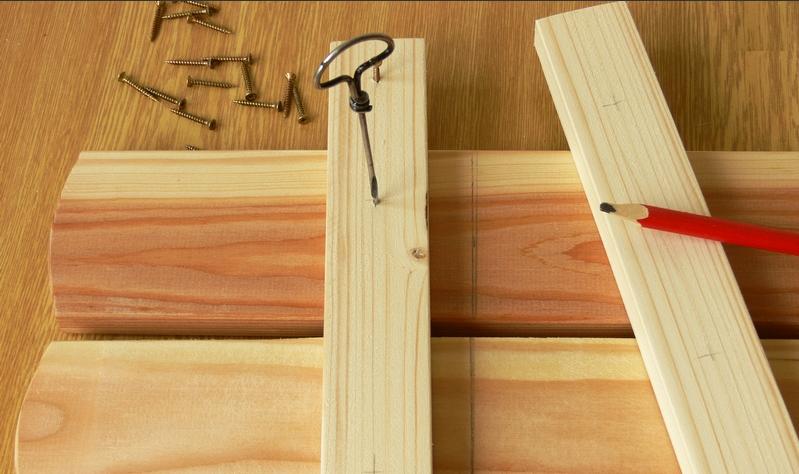 3. Готовые дощечки положим ровно одна возле другой на расстоянии, чтобы общая ширина составляла 40 см. Из узкой рейки шириной 4,5 см и толщиной 2см вырежем две планки длиной 44 см. Этими планками соединим дощечки. На дощечках наметим места , где будут находиться планки : первая 16 см от нижнего края, вторая 21 см над ней.