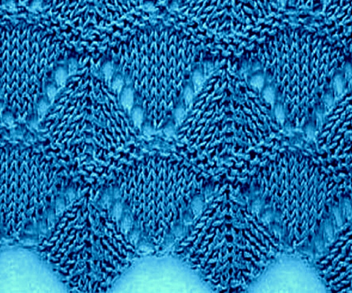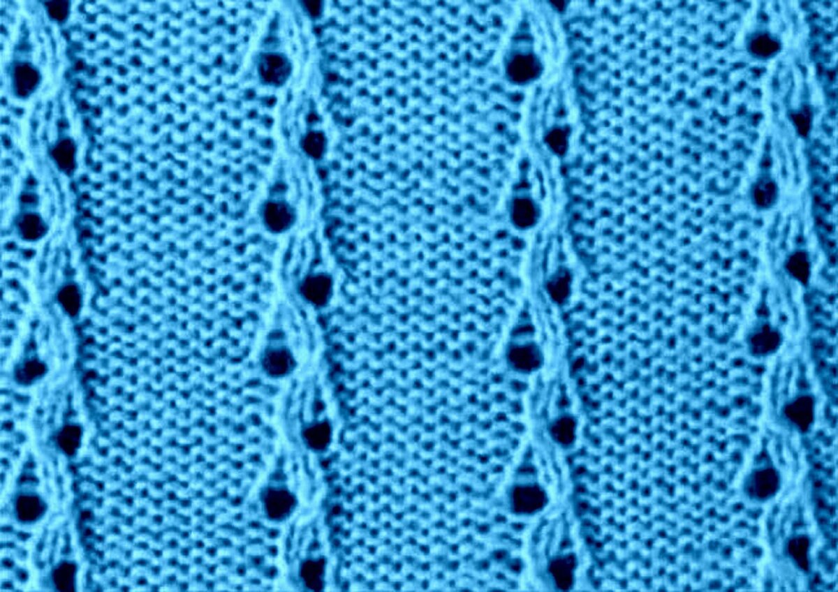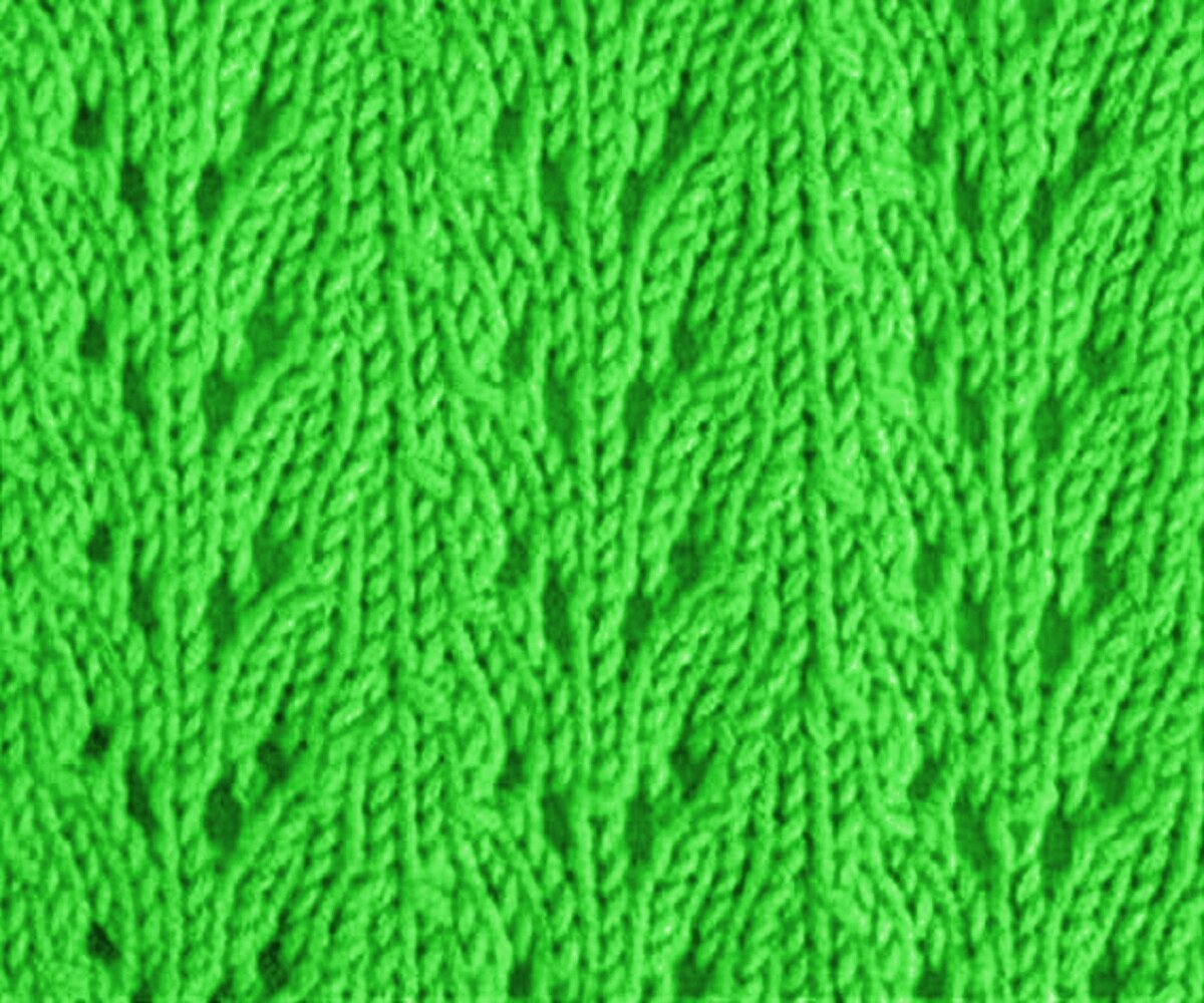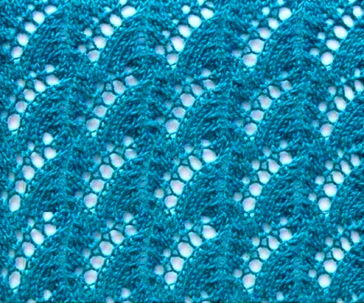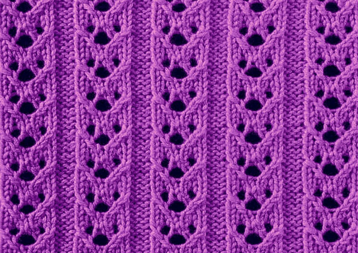 Этот узор не был бы так хорош, если бы не пару рядов изнанки — она облагораживает ажур и добавляет ему изюминку. А если ещё и выделять эти ряды другим цветом, получится оригинальный и необычный ажур с волнистыми вставками.