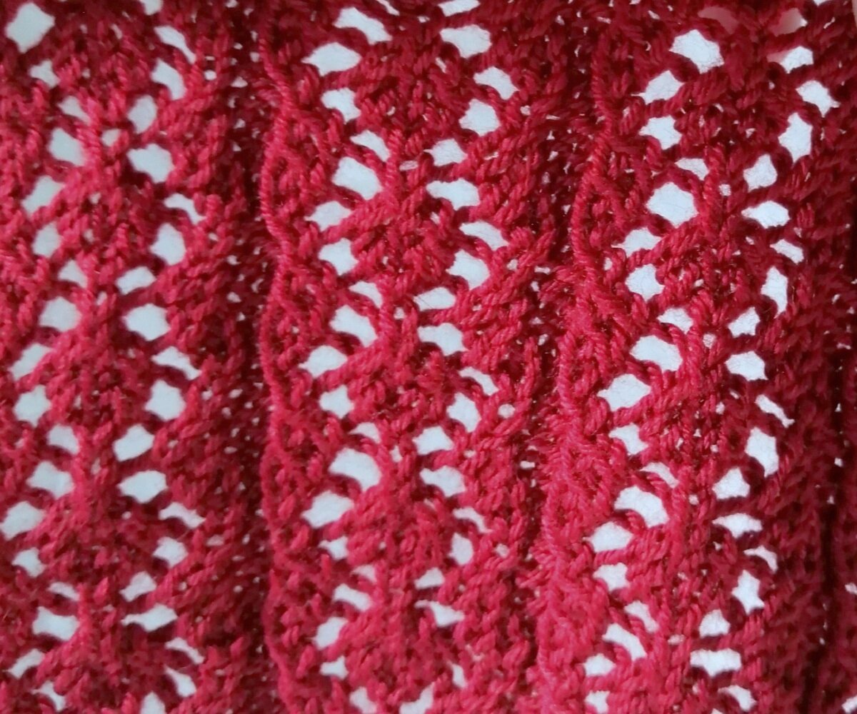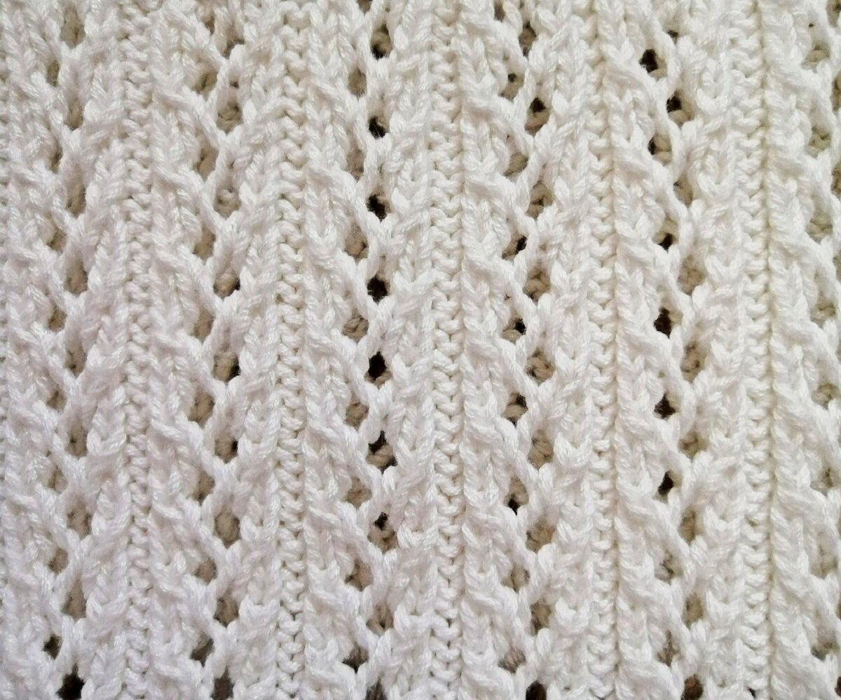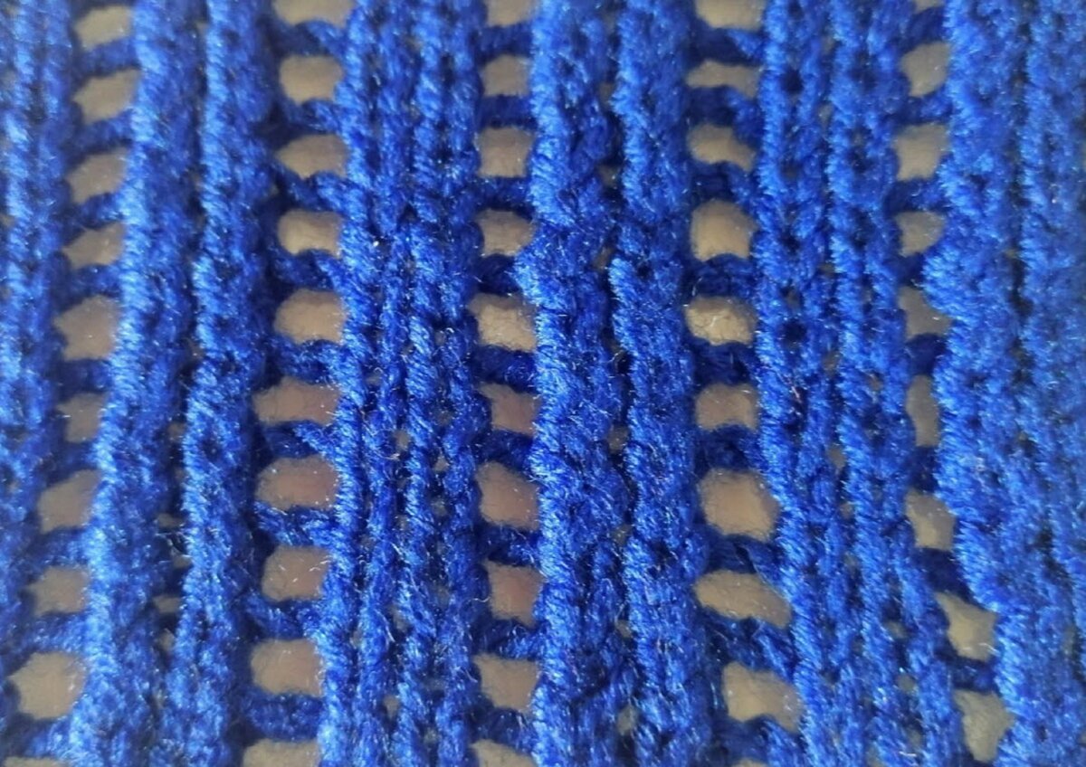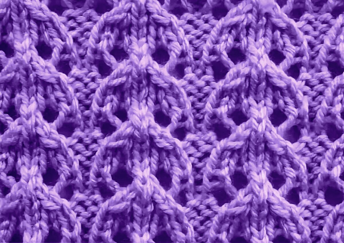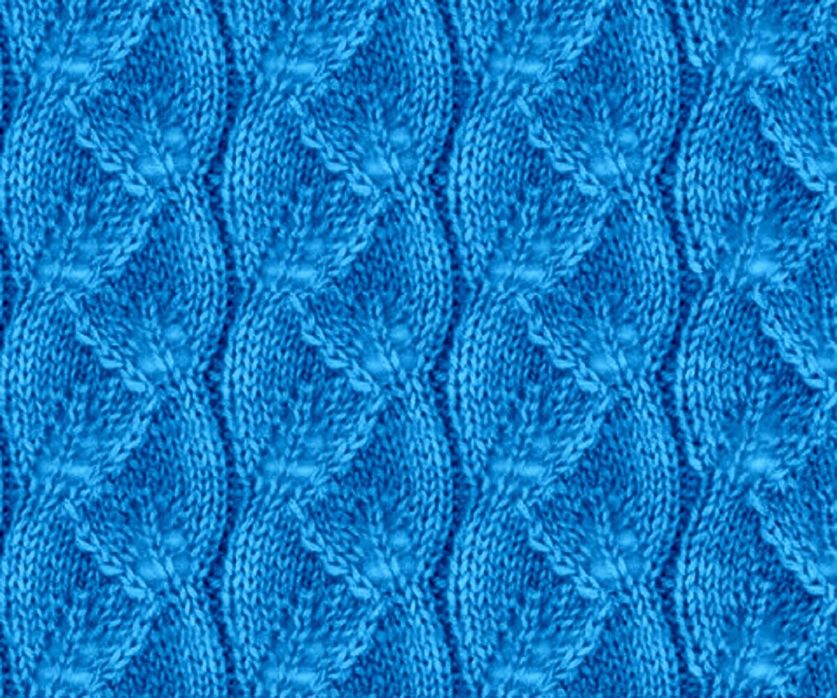 Этот узор не был бы так хорош, если бы не пару рядов изнанки — она облагораживает ажур и добавляет ему изюминку. А если ещё и выделять эти ряды другим цветом, получится оригинальный и необычный ажур с волнистыми вставками.