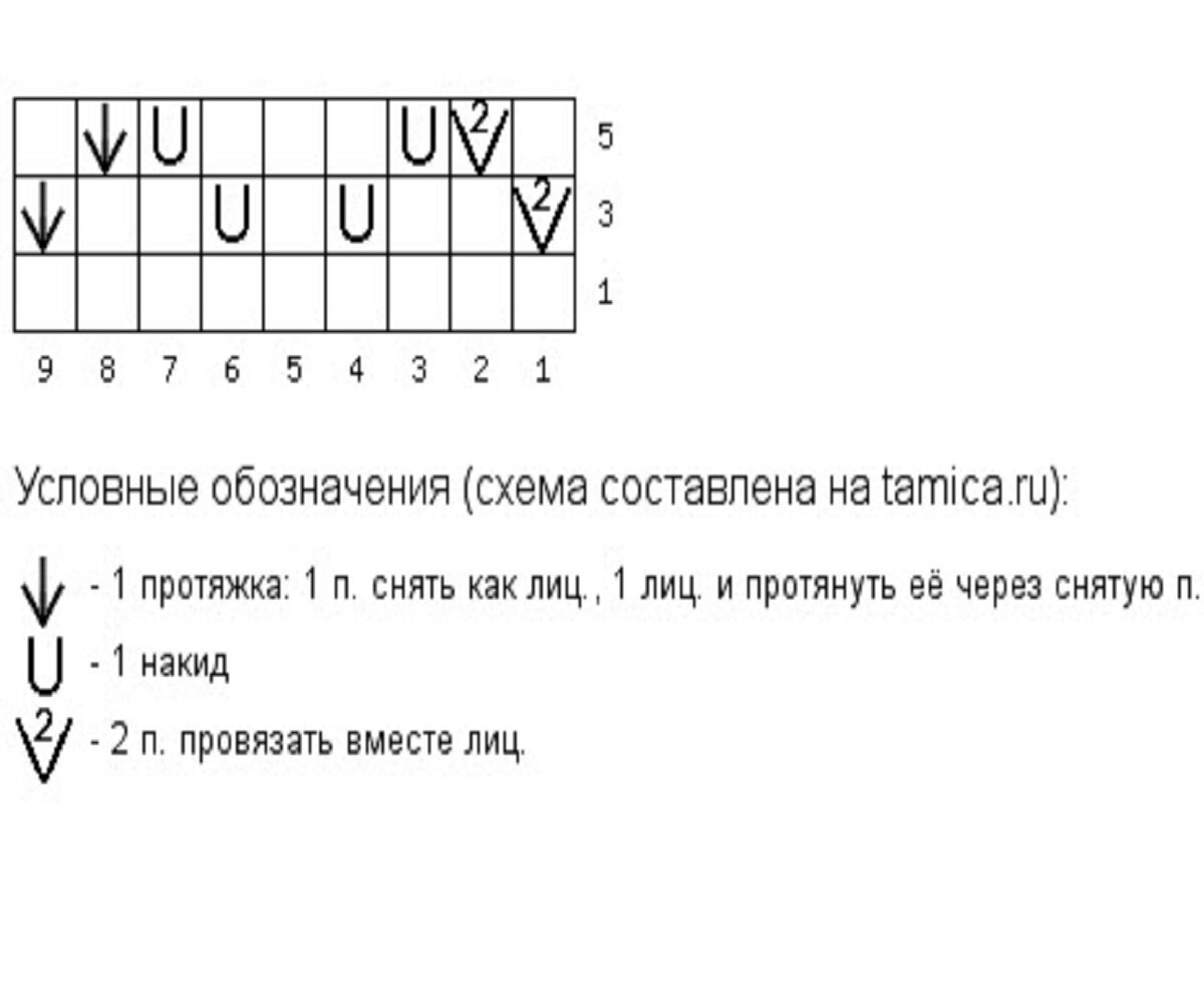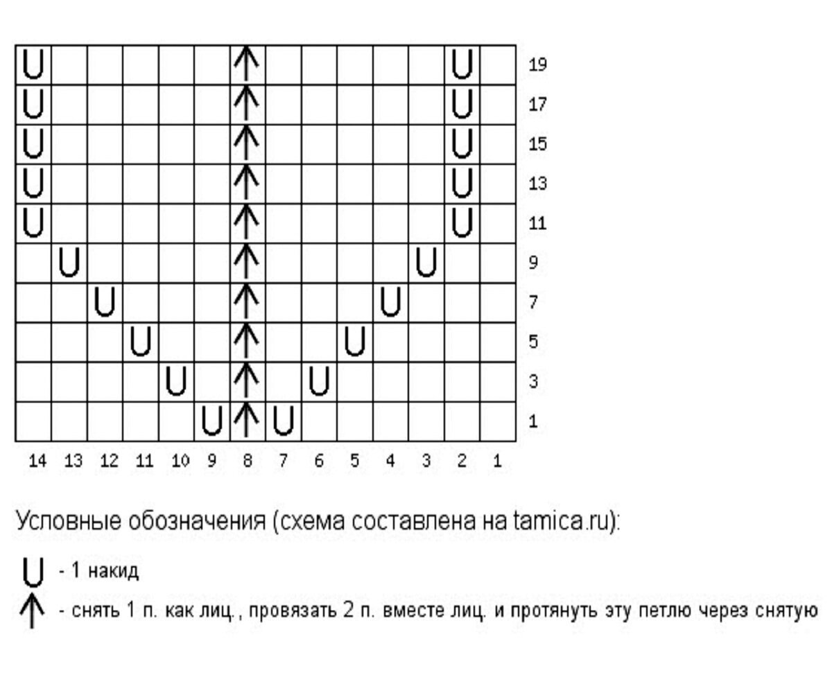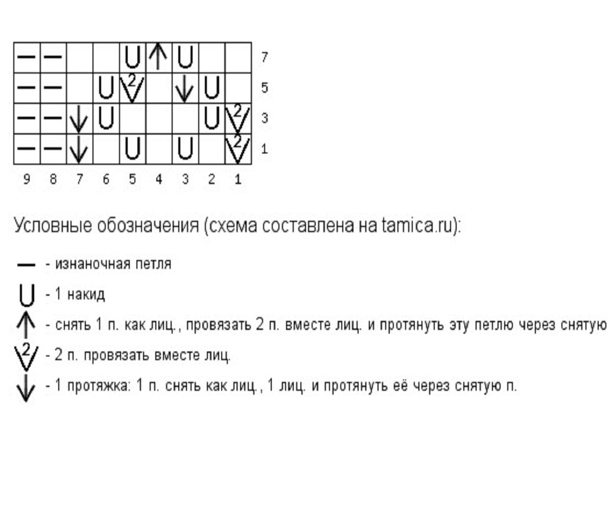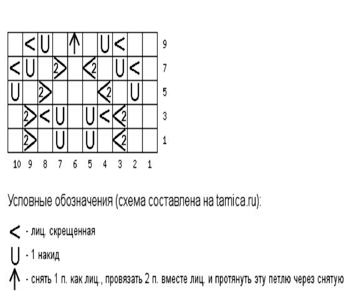 Раппорт узора 10+1 петля для симметрии (добавляем в самом конце). На схеме указаны нечётные ряды, чётные вяжем изнаночными.
