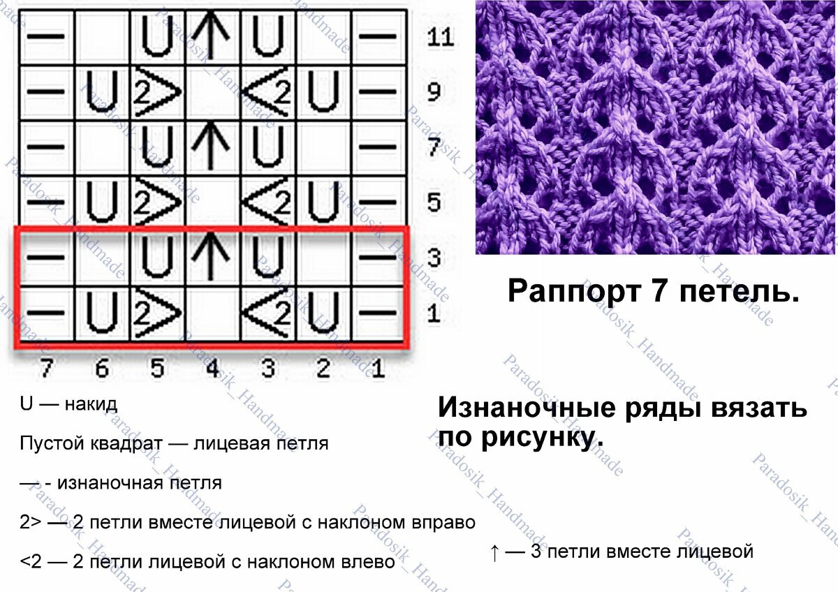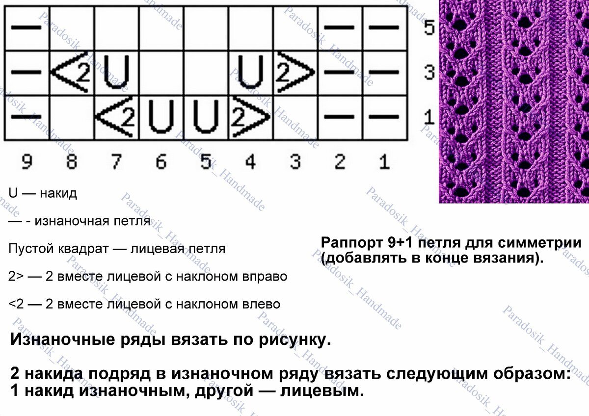 Раппорт узора 9+2 петли для симметрии. Можно вязать как с изнаночными дорожками, так и без них. Изнаночные ряды вяжем по рисунку (если без изнаночных дорожек, то все петли изнаночными).