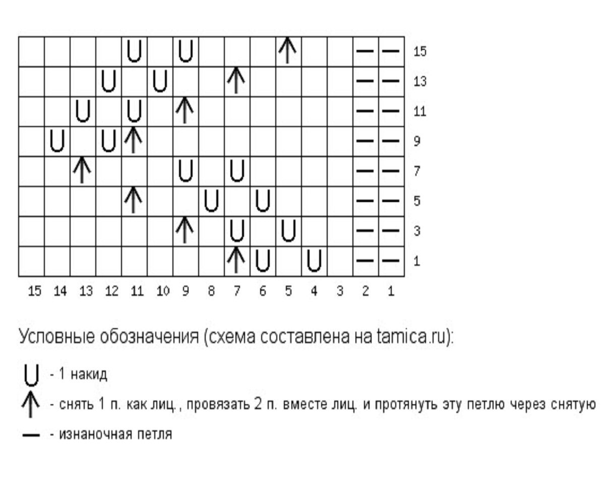 Раппорт узора 15+2 петли для симметрии (2 изнаночные в конце). На схеме указаны только лицевые ряды, изнаночные вяжутся по рисунку.