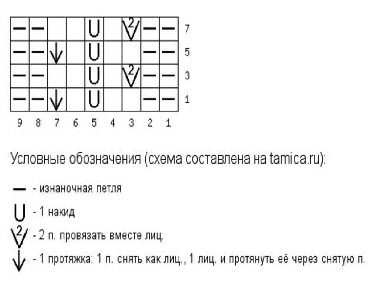 Раппорт узора 7+2 петли для симметрии. Изнаночные ряды вязать изнаночными.