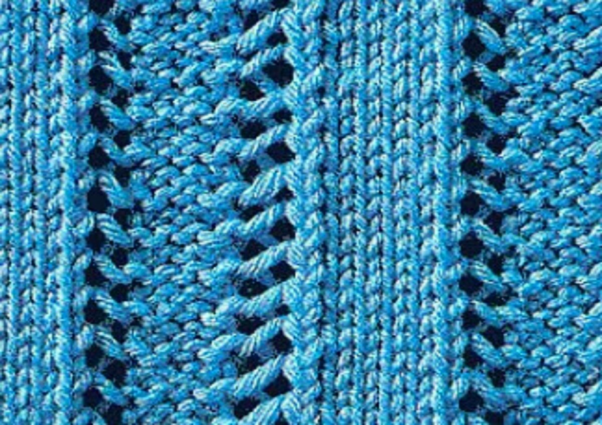 Красивый ажур, который идеально подойдёт при вязании разными цветами, так как благодаря нему полосы цветной пряжи будут складываться в красивые и плавные зигзаги. И пусть вас не пугает количество рядов (я же обещала простые узоры) — запутаться в этом узоре невозможно, он действительно очень лёгкий. Вы поймёте, когда начнёте вязать.