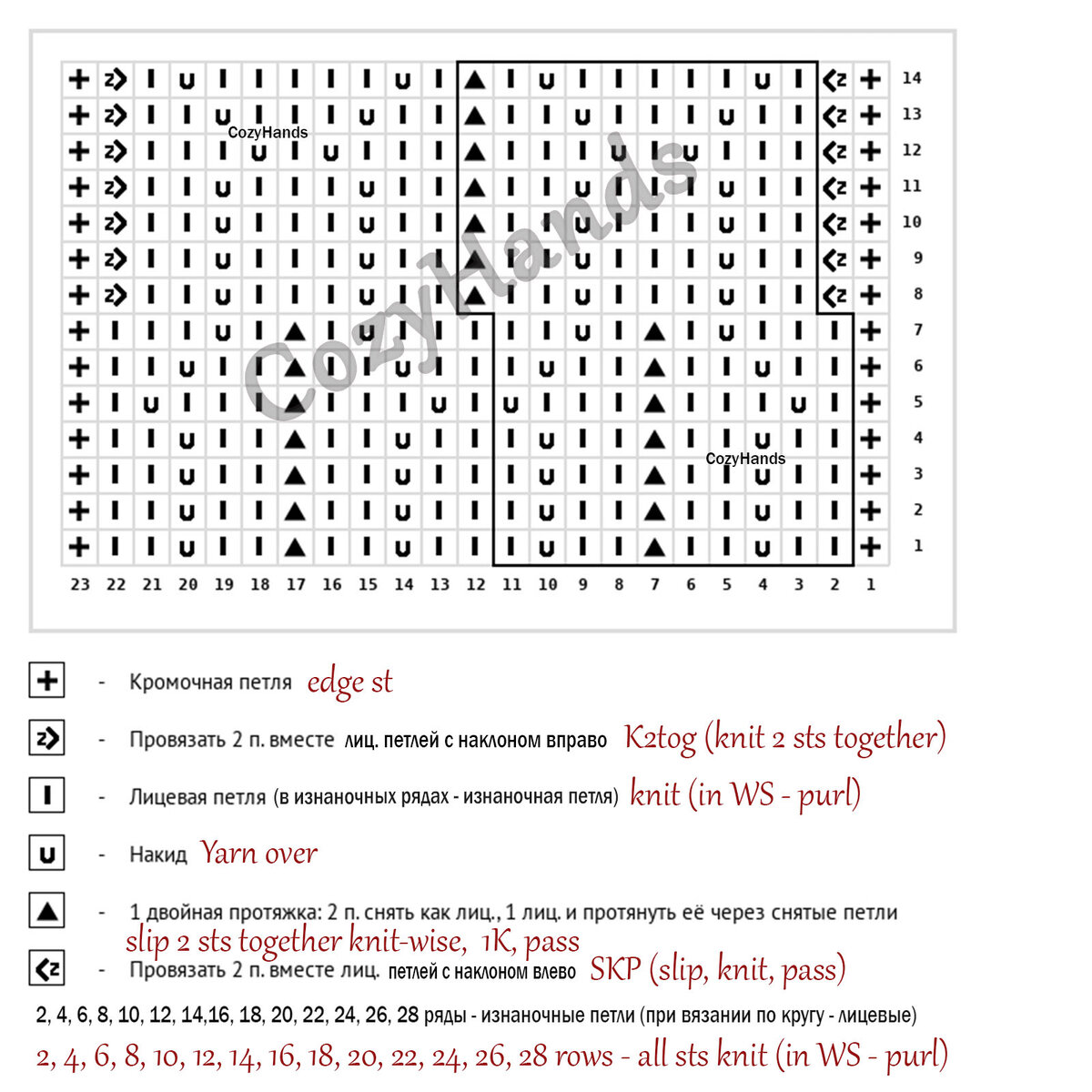 2, 4, 6, 8, 10, 12, 14, 16, 18, 20, 22, 24, 26, 28 ряд (изнаночный): кром.п., изнаночные петли, кром.п.