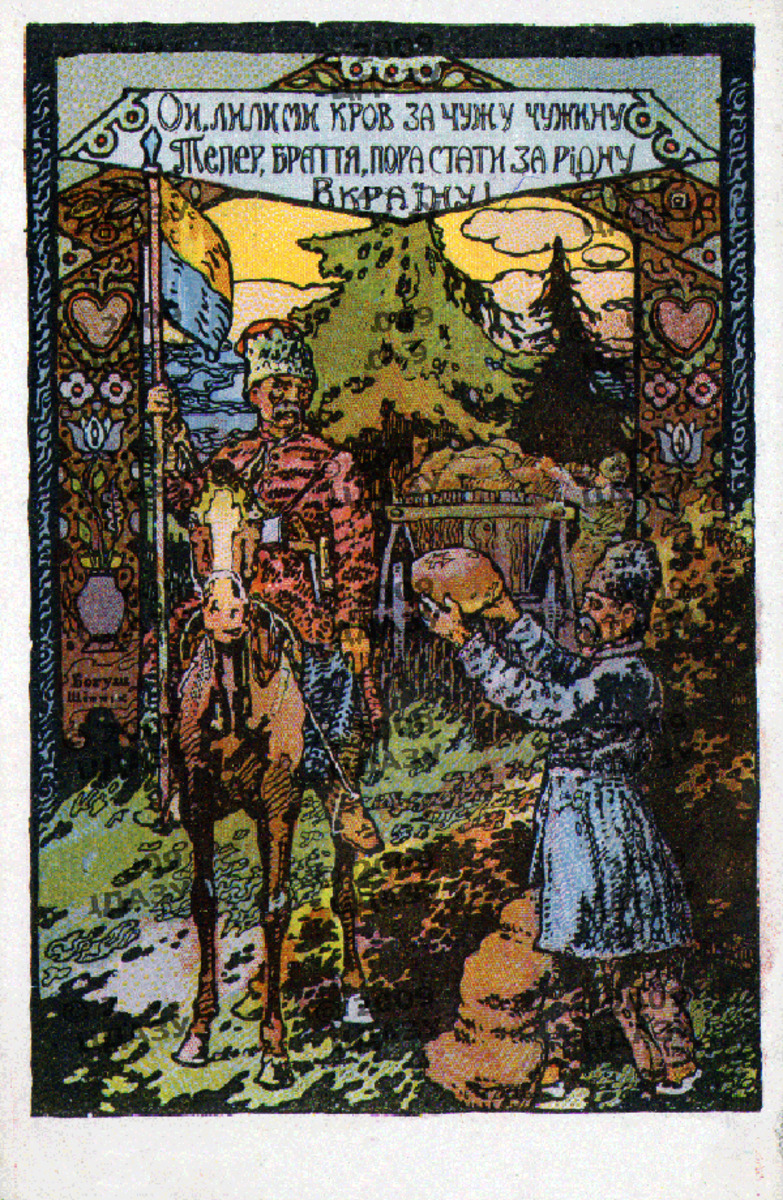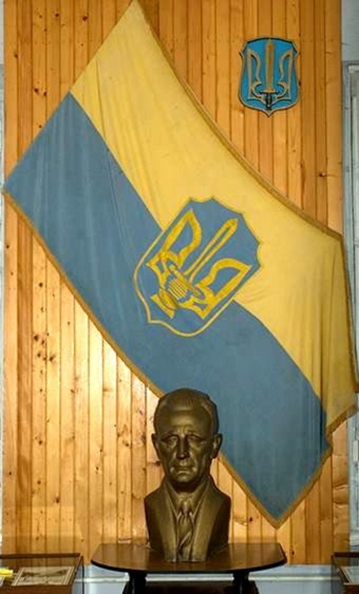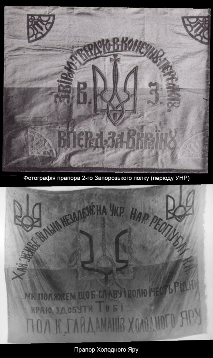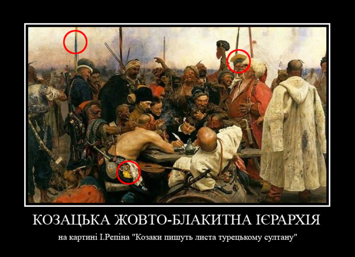 Про те, що в українцiв побутувала жовто-блакитна iєрархiя, вказує ретельно опрацьована картина I.Репiна "Козаки пишуть листа турецькому султану", стрiй воякiв "жовто-блакитникiв" отаманцiв петлюрiвцiв i навiть сама усталена, давнiшня фраза - "жовто-блакитний" (анiж "блакитно-жовтий"). "У XVIII ст. жовта-блакитна барви домiнували навiть у побутi. Як свiдчили сучасники, одяг козакiв цього часу мав нацiональнi кольори: гайдамаки iонти були вдягнутi в жовтi жупани i синi шаровари пiдчас повстання 1768 р." ("Українське народознавство". Г. Лозко. с. 228. "Зодiак-Еко". К., 1995.). Цікаво, що російський імператор Олександр ІІІ, перш ніж придбати картину Репіна за 35 тисяч рублів, велів міністрові імператорського двору розпитати у фахівців про те, чи немає в тих барвах прихованих чужоземних впливів. На що російський філолог і знавець давніх пам'яток історії Федір Корш відповів: "...знамена казацкие, изображенные художником Репиным на его картине, не содержат по своему цветовому набору никаких иностранных веяний, а отображают в себе извечную преемственность цветов золотых и небесных, постоянно присущих для всех знаков отличий в Южной Руси (Малороссии) еще со времен Великих князей Киевских, вплоть до роспуска запорожской вольницы, согласно повелению Императрицы Екатерины Великой. Сказанному имеется предостаточно письменных подтверждений в отечественных и иностранных сугубо исторических источниках, а равно - в ряде предметов материального искусства тех давних времен".