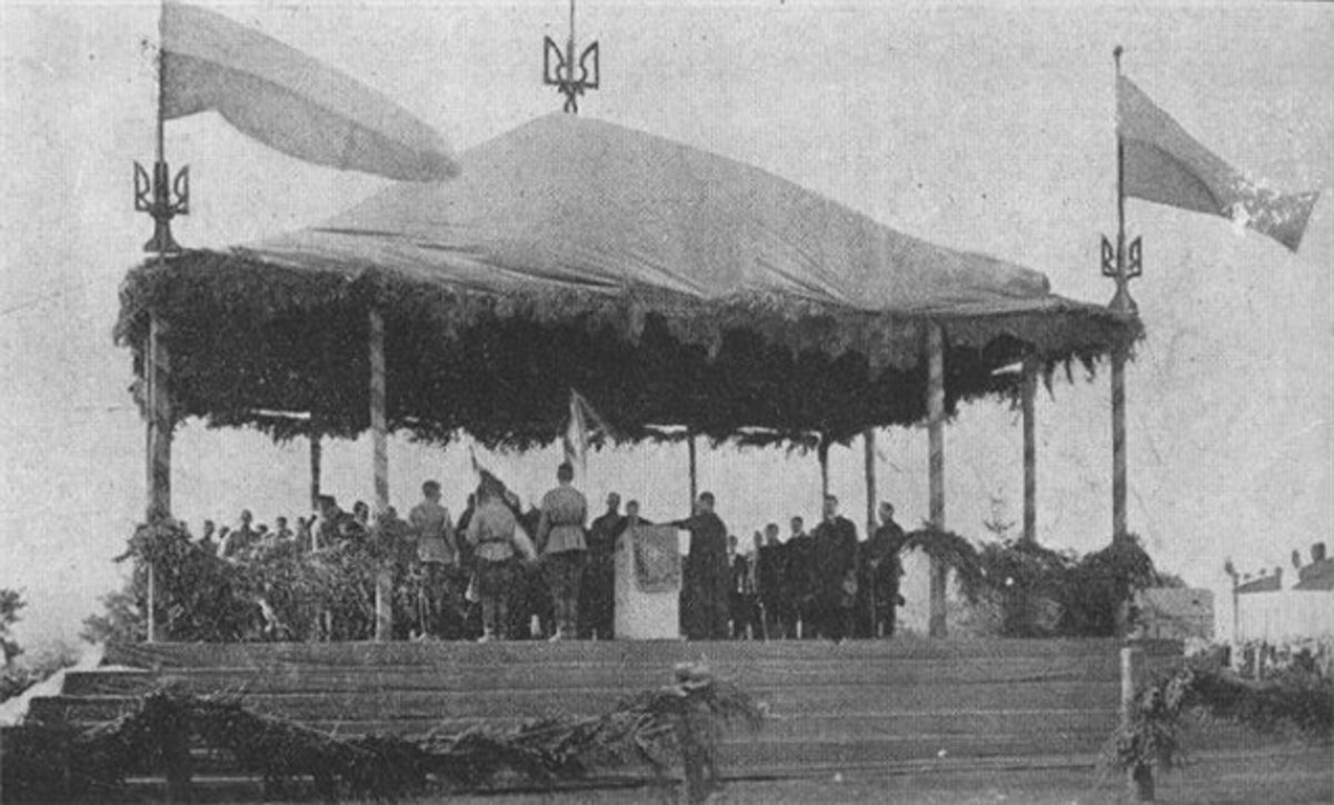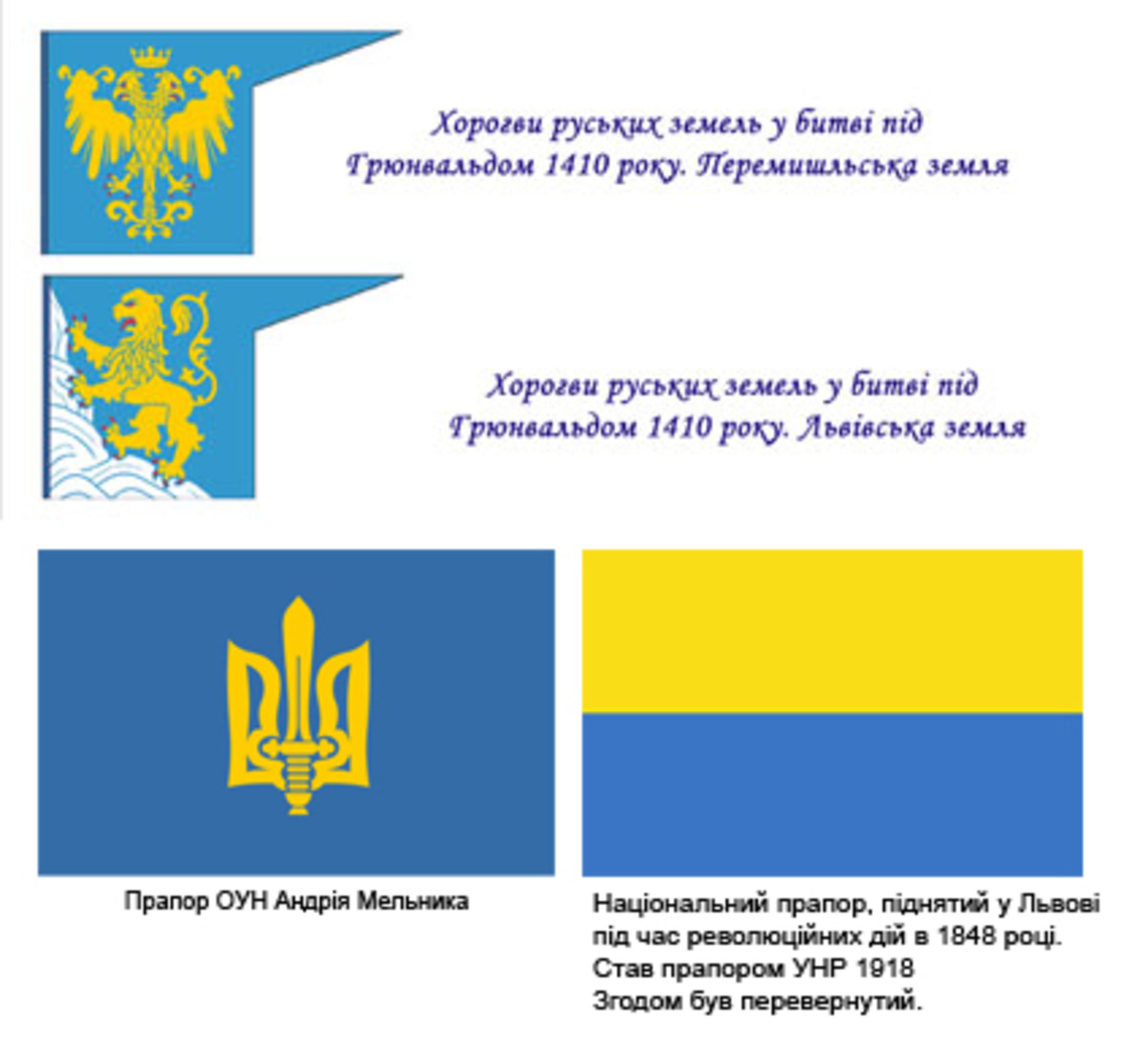 Ще в березнi 1914 р. на столiття Дня народження Т.Г.Шевченка, незважаючи на заборону росiйського уряду, київське студентство вийшло на демонстрацiю пiд жовто-блакитними прапорами. 25 березня 1917 р. жовто-блакитнi i малиновi прапори майорiли також i на двадцятитисячнiй манiфестацiї в Петроградi. Не випадково в 1917 р. пiднятi жовто-блакитнi прапори з окопiв протилежних воюючих армiй росiйської та нiмецько-австрiйської iмперiй призвели до всесвiтньо унiкального феномену - братання українцiв на нейтральнiй смузi. Під жовто-синім прапором йшли у бій українські юнаки під Крутами у 1918 році. Колишній глава Генерального секретаріату Володимир Винниченко згодом писав: «Ми рішуче нічого не міняли в суті тої державності, що була за часів Тимчасового уряду. Ми тільки міняли національну форму її — замість біло-синьо-червоного прапору мі вішали жовто-блакитний». І що саме це поєднання фарб голова Центральної Ради Михайло Грушевський запропонував для основного символу УНР. Cпівець української Визвольної революції видатний поет Олександр Олесь 1917 року вітав українське військо такими словами: "Українське військо, мов з могили встало, Загриміло в бубни, в сурмоньки заграло, Розгорнуло прапор соняшно-блакитний, Прапор України! Рідний, заповітний!"