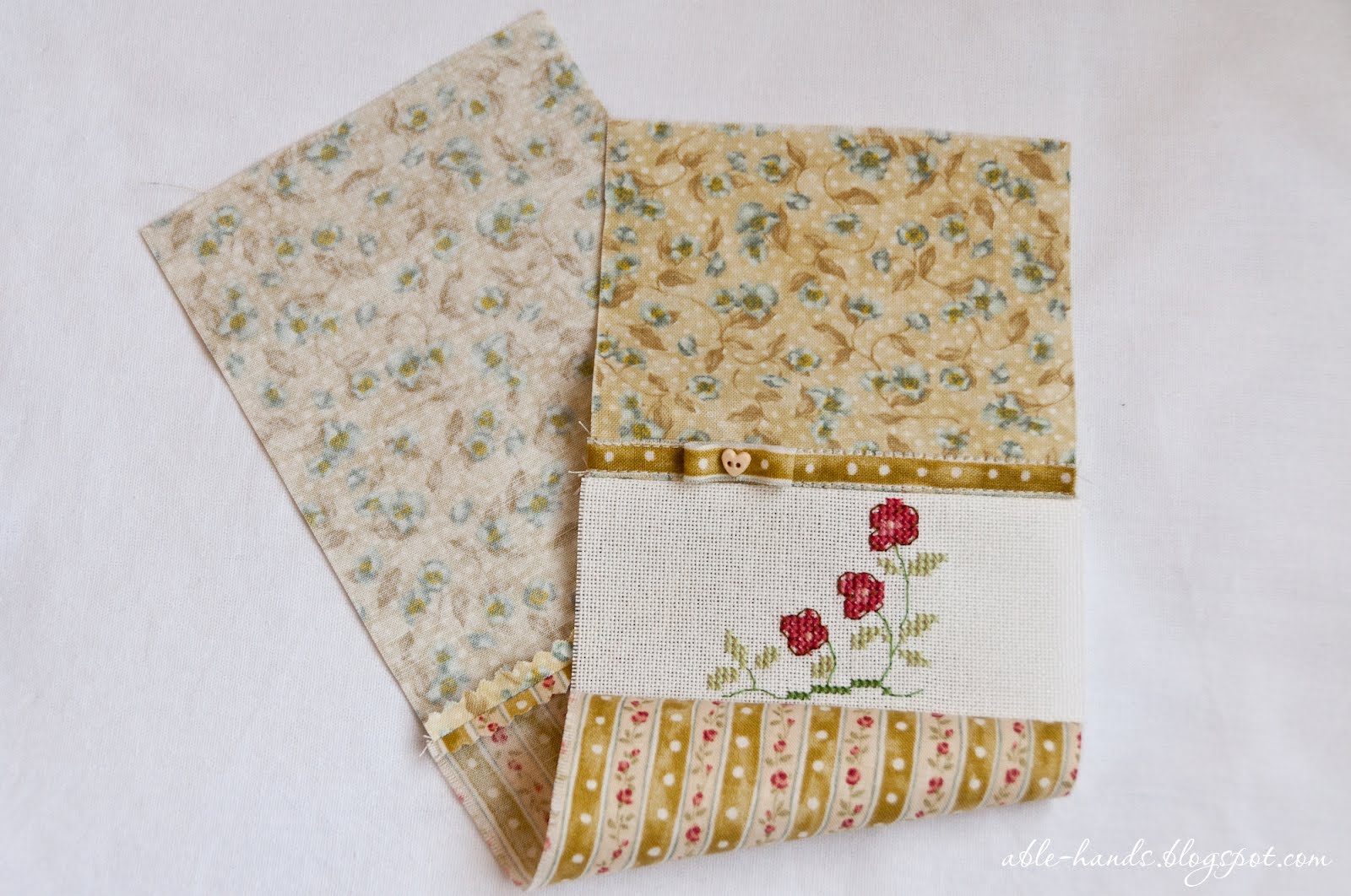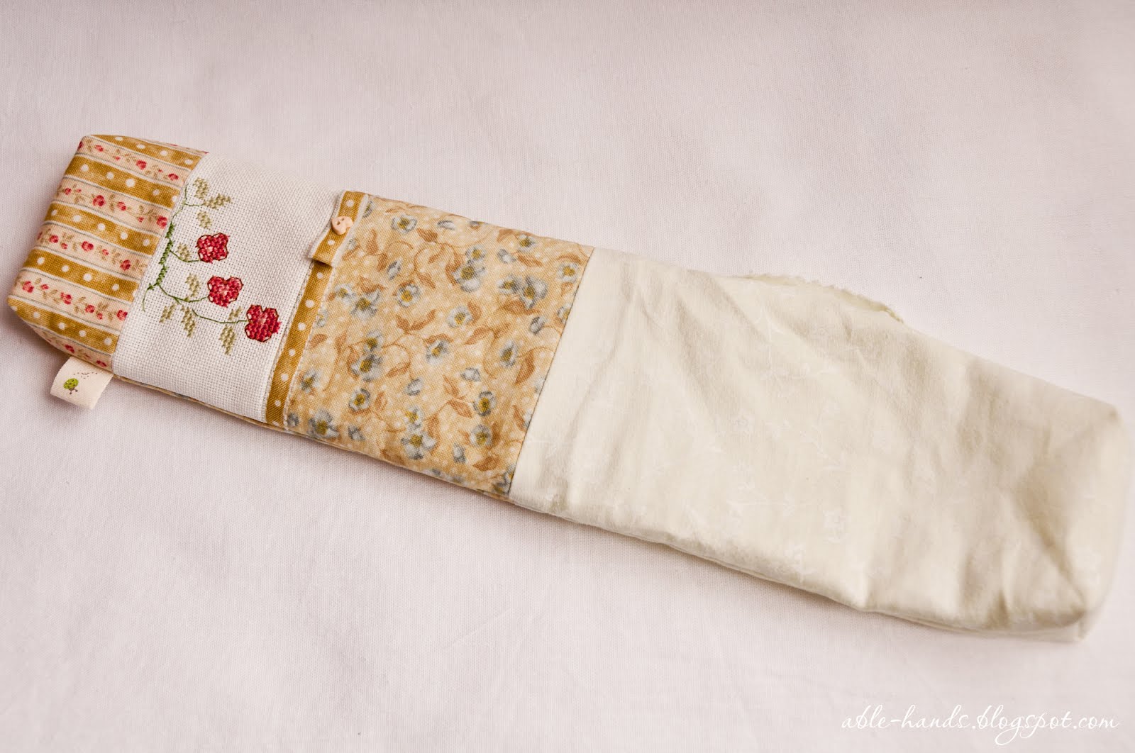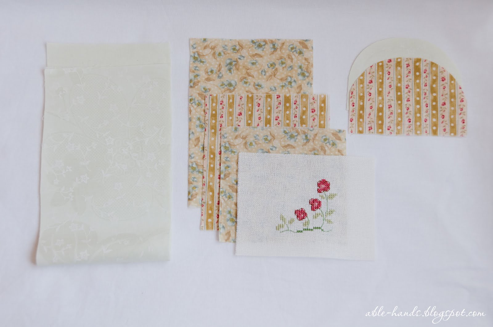 Для изготовления чехла нужно выкроить из ткани прямоугольник размером 11*38 см для лицевой стороны (у меня этот прямоугольник состоит из: двух прямоугольников 15*11 и 10*11 см из одной ткани, одного прямоугольника 12*11 см из другой ткани и вышитого мотива 7*11 см), такой же по размеру прямоугольник для подкладки и две детали для клапана размером 7*10 см (одна - из лицевой ткани, вторая - из подкладочной). Все размеры указаны с учетом припусков на швы. Еще понадобится синтепон или флизелин и магнитная застежка. Я использовала клеевой объемный флизелин, им уплотняла прямоугольник для лицевой стороны и одну из деталей клапана.
