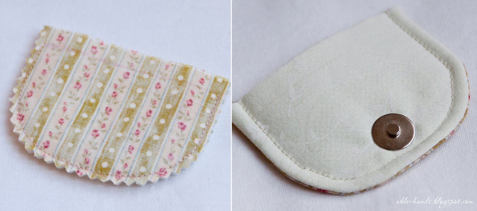 Две детали для клапана складываем лицевыми сторонами друг к другу и сшиваем по трем сторонам кроме верха. Припуски на швы надсекаем, выворачиваем клапан на лицо, проглаживаем и прокладываем по краю отделочную строчку. Устанавливаем или пришиваем кнопку.