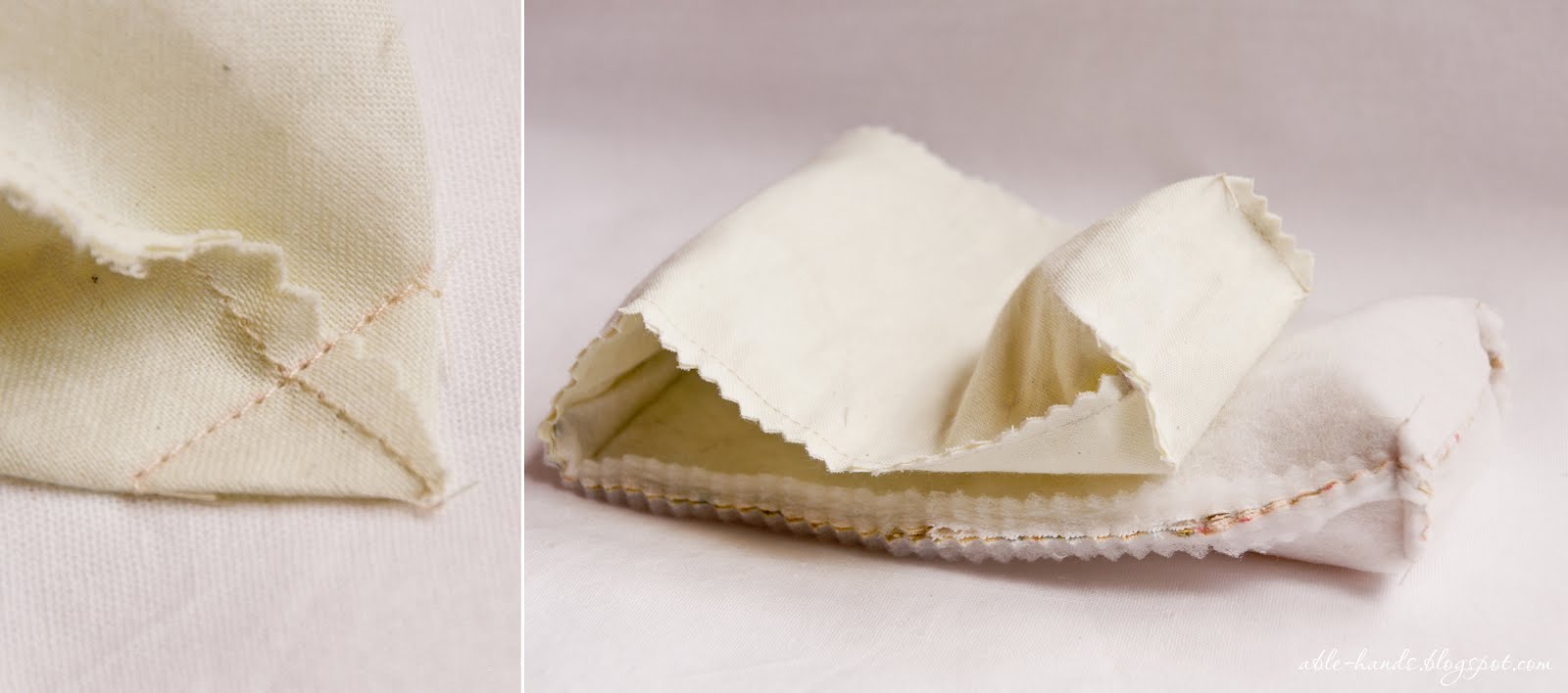 Формируем уголки: совмещаем шов с серединой донышка и прокладываем перпендикулярный ему шов, отступив от уголка 1,5 см. Это проделываем со всеми четырьмя углами и обрезаем лишнее.