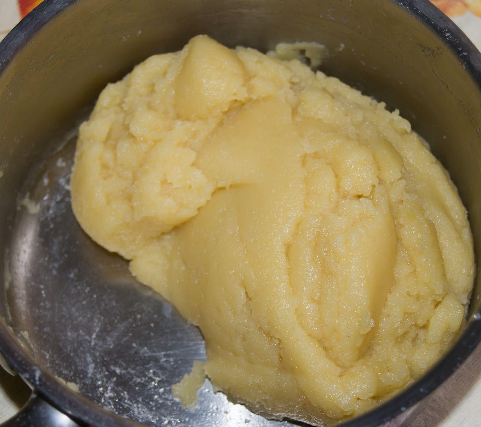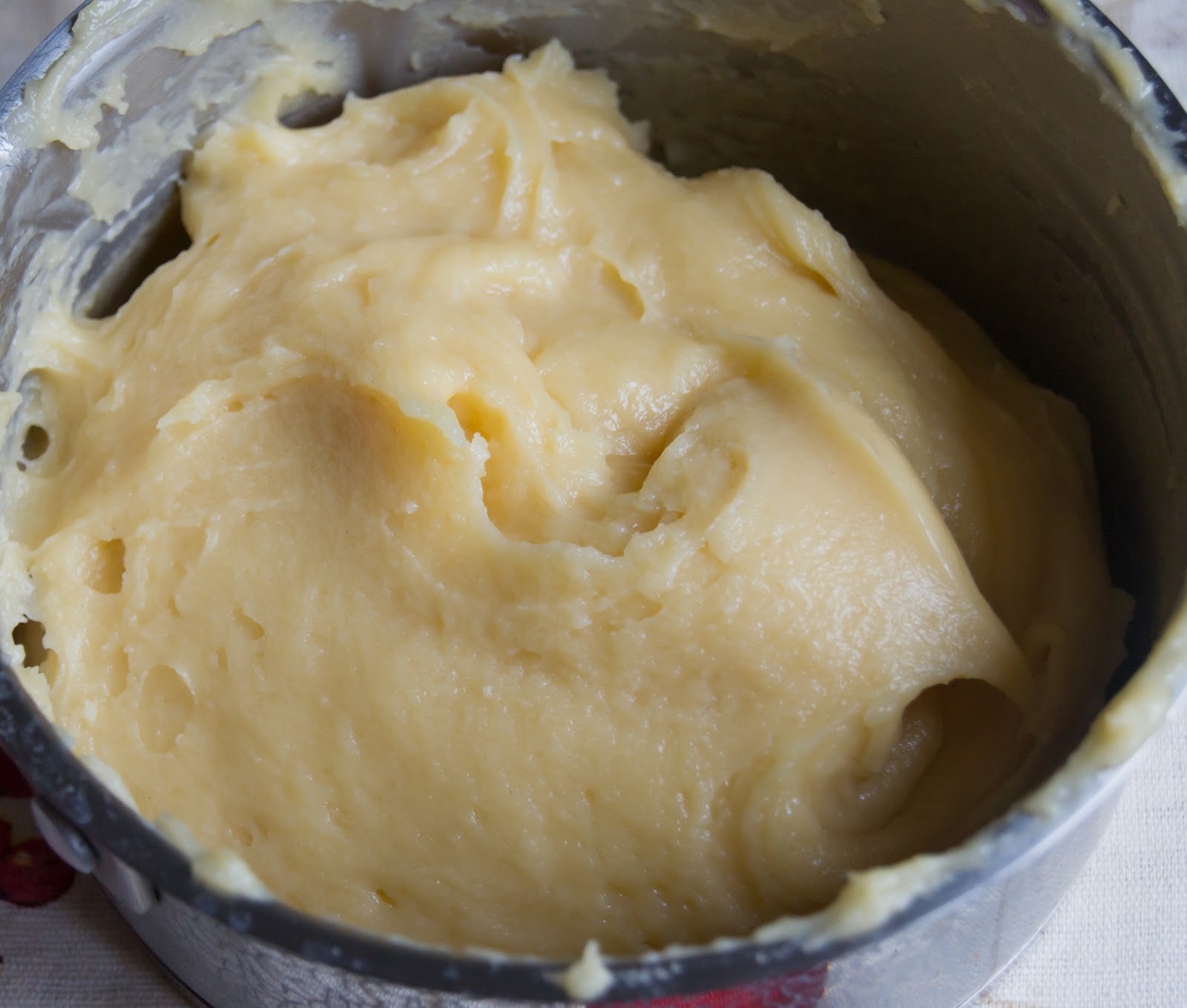 1. Приготовить заварное тесто шу: разогреть духовку до 200 градусов. Смешать в кастрюле воду, молоко и сахар, положить сливочное масло. Довести до кипения и дать покипеть 1 минуту. Затем снять с огня, всыпать просеянную муку, соль и мешать шпателем до получения однородной массы. Поставить на плиту и продолжать помешивать шпателем, пока тесто шу не начнёт отставать от стенок кастрюли. Снять с огня и дать тесту остыть в течение 2-3 минут, периодически помешивая.
