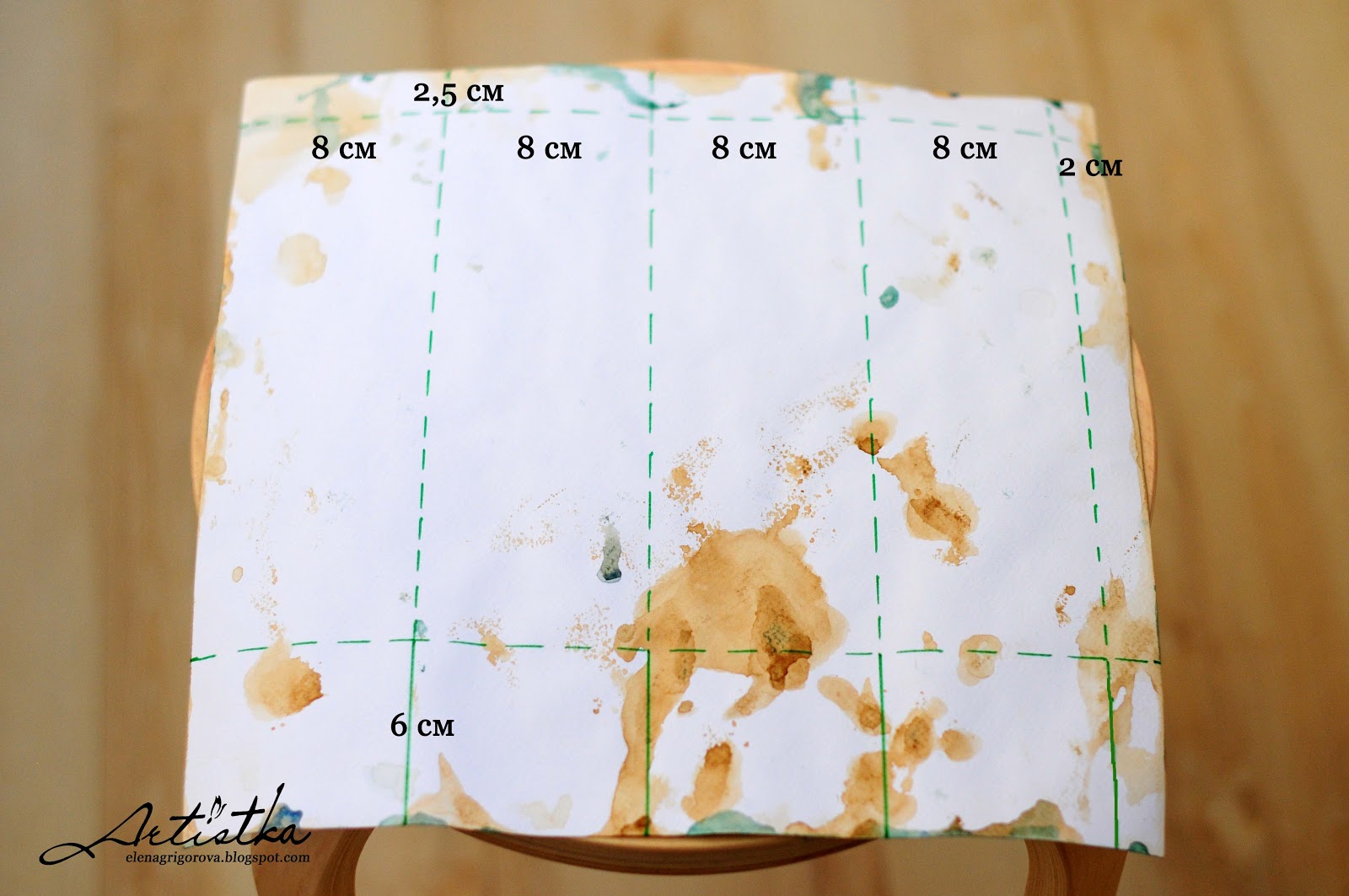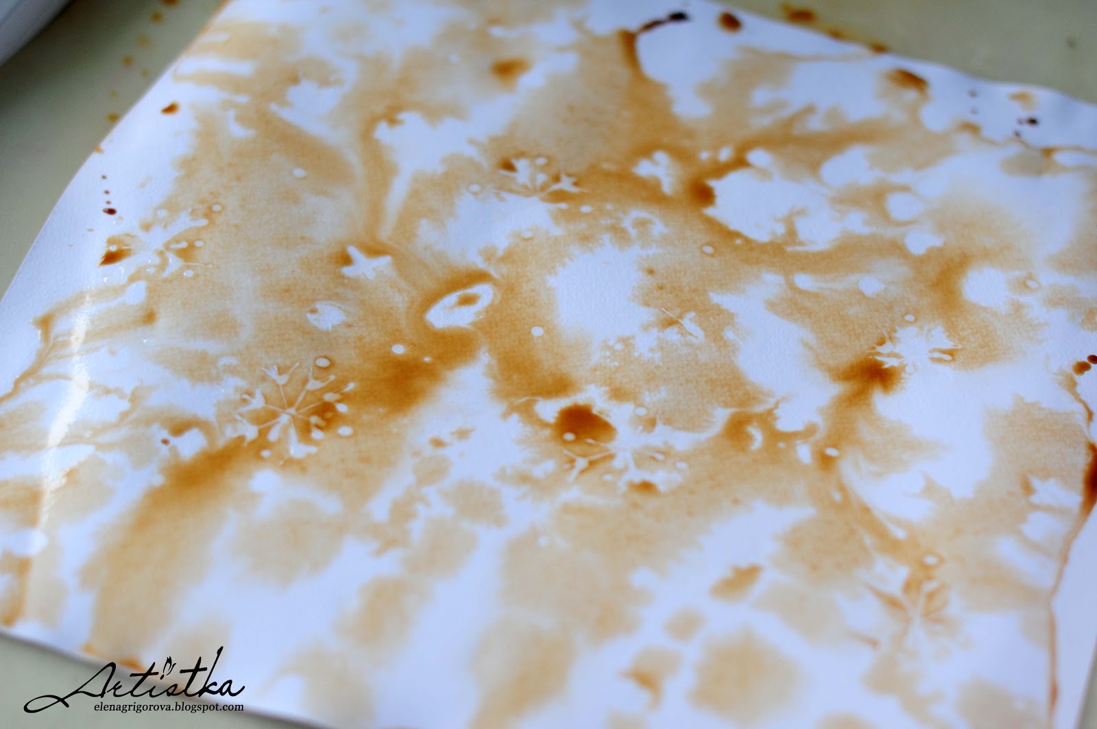 Места, оставшиеся белыми, промокаем губкой, смоченной в чистой воде. Она немного растворяет кофейные разводы, и рисунок становится более равномерным. Сушим.