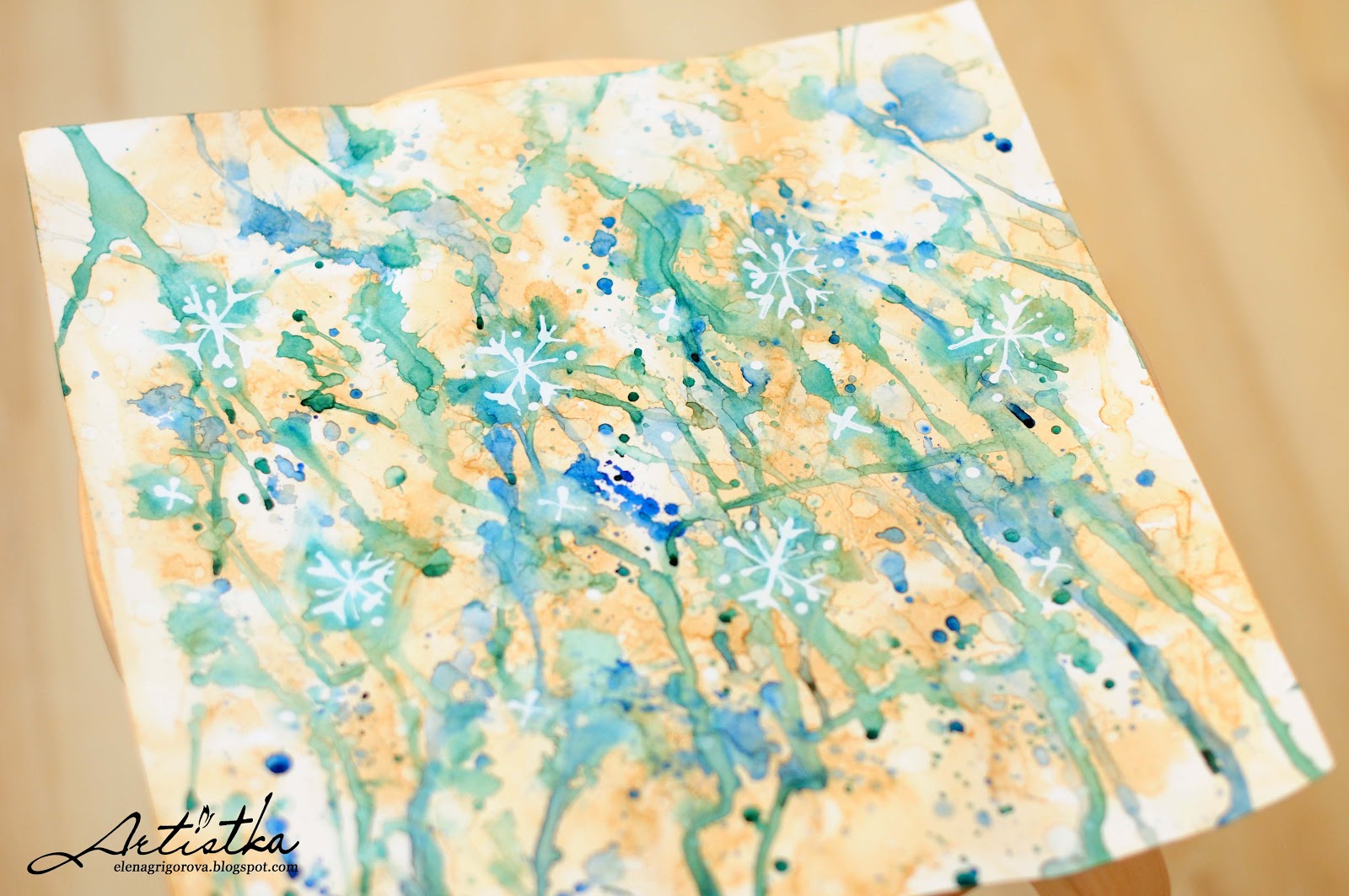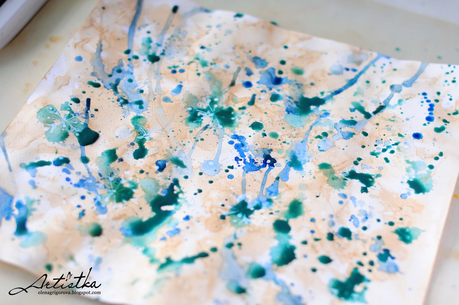 Далее берем акварель, подходящую по цвету для нашей задумки, у меня это синий цвет. Так же обильно брызгаем, Сушим.