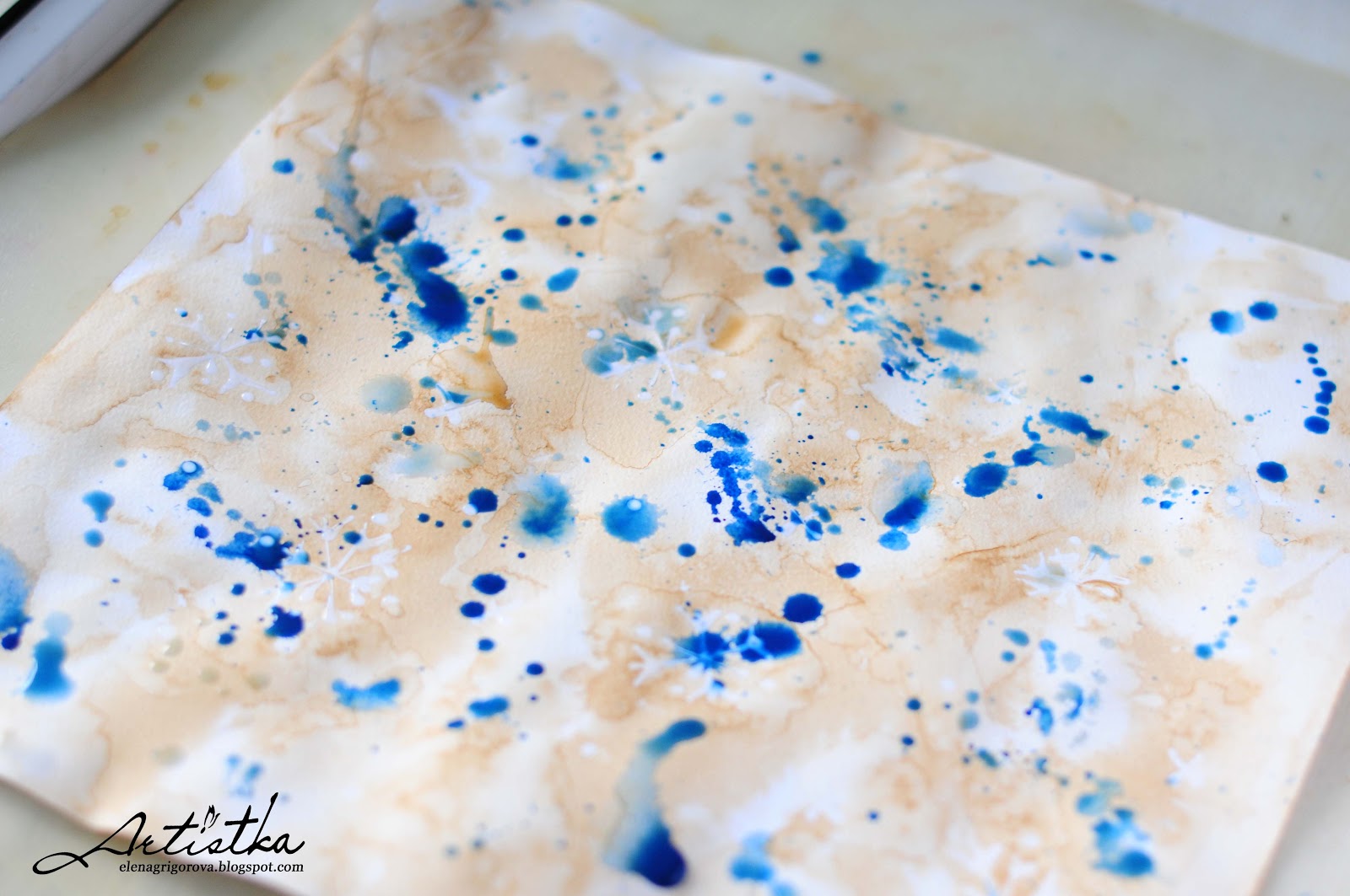 Чтобы получить самые красивые разводы, на высохшую бумагу брызгаем чистой водой (с кисти или просто стряхивая смоченную руку). Вода растворяет краски, и получается очень красиво. Сушим и влажной ватной палочкой протираем от краски наши снежинки. Они остались белыми и объемными!