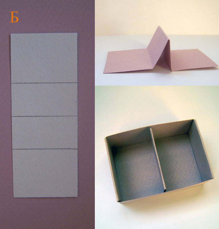 3. Деталь Б сгибаем как показано на фото и приклеиваем к дну шкатулочки. Таким образом получим два отделения. Эту деталь можно не использовать, если в шкатулочке предполагается лишь одно основное отделение
