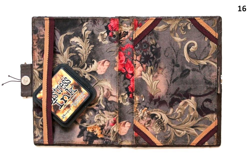 16) Теперь приклеиваем застежки на наши «хвосты» и соединяем две боковины с основной обложкой. Все операции по проклеиванию мы выполняем с помощью клея «Момент-Кристалл», ПВА нам понадобился лишь для создания фактуры. Т. к. края подклада мы не подгибали я прошлась по ним винтажными чернилами, чтобы закрыть светлую прожилку подкладочной ткани и картона.