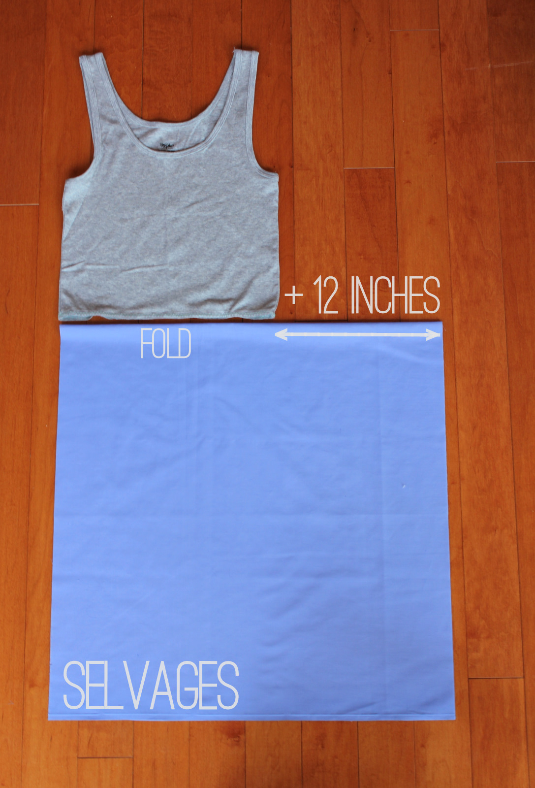 Вы хотите, чтобы (два) панелей для вашего юбка была 12 "шире, чем ширина вашего танка. Вырезать как показано ниже. Вырезать вдоль сгиба, так что у вас есть два панелей из ткани.
