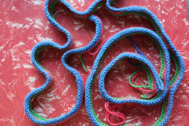 Row 3 : Join red to pink 3rd ch, chain 3, and then 3dc in the gaps between the clusters of the previous row, continue till the end of the row, and finish with 3 dc in the last gap.