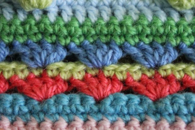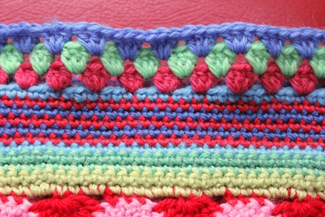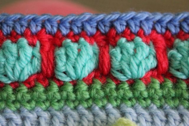 After the 3 granny stripe rows, I did 2 rows of hdc. In the dark blue row, every third stitch I did into the gap between the previous rows clusters. The pale blue row is just hdcs straight across.