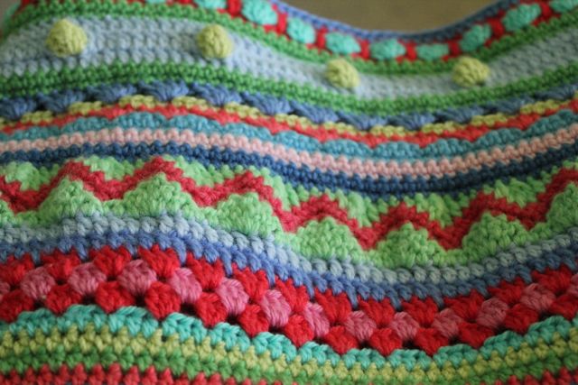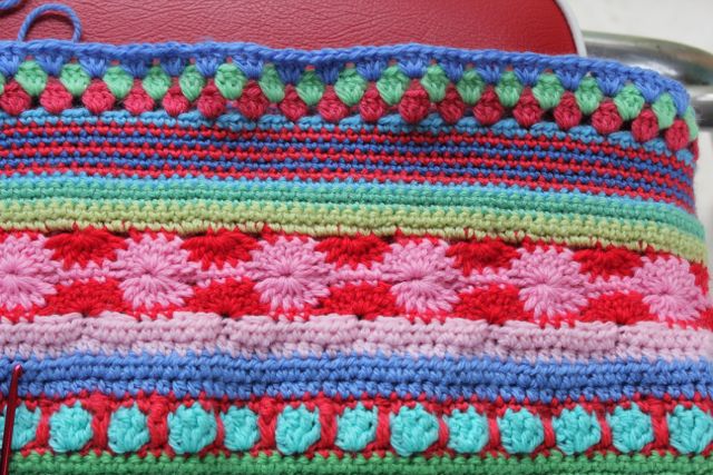 A few people have been a bit concerned about how the blanket stays straight with all the different patterns, but I think just remember to keep the same number of stitches in each row and it will all work out in the end. ( ie, if we decrease in one row, in the next we increase the same number to keep it all square, hope you get what I mean!) I am sure it will all be fine!