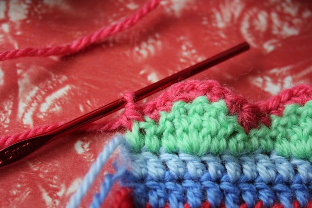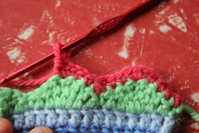 I finished the 5 rows of hdc, and then decided to do the granny stripes in red and pink.