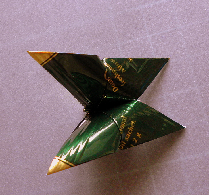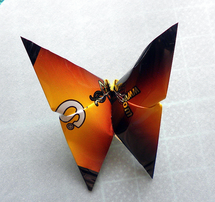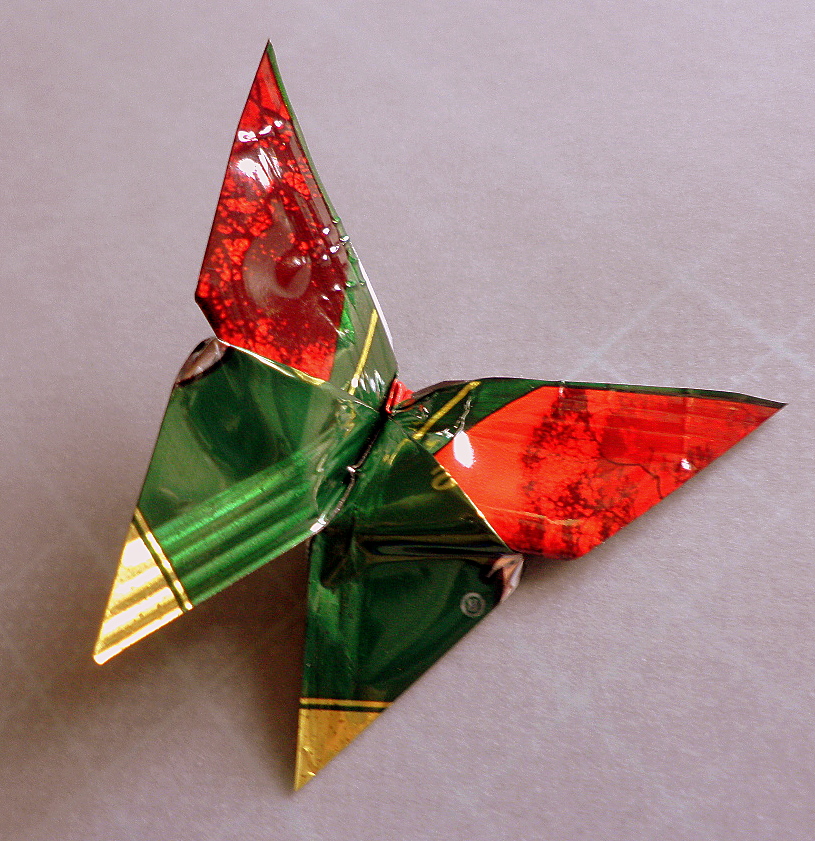 Бабочка из красно-зеленой упаковки от чайного пакетика |