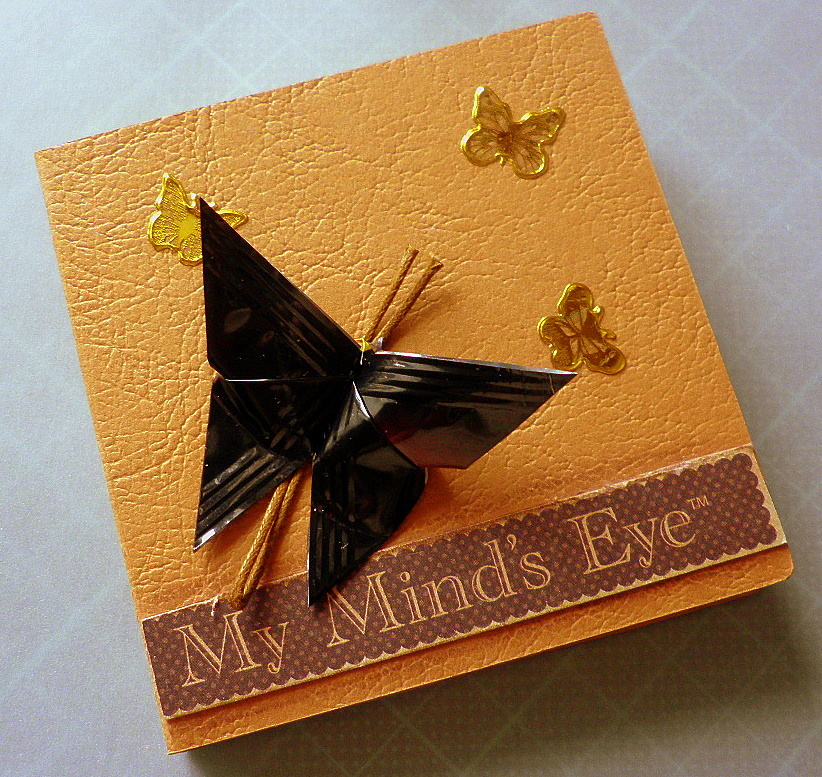 А это - пример использования полученной бабочки в скрапбукинге. Сделана она из лицевой стороны желто-коричневой упаковки от чайного пакетика. В результате складывания квадратика из упаковки желтые листья и белый текст полностью спрятались, и бабочка вышла оригинального темно-шоколадного цвета. Я не стала дополнительно ничем ее украшать, но при желании можно добавить точечной росписи, например.