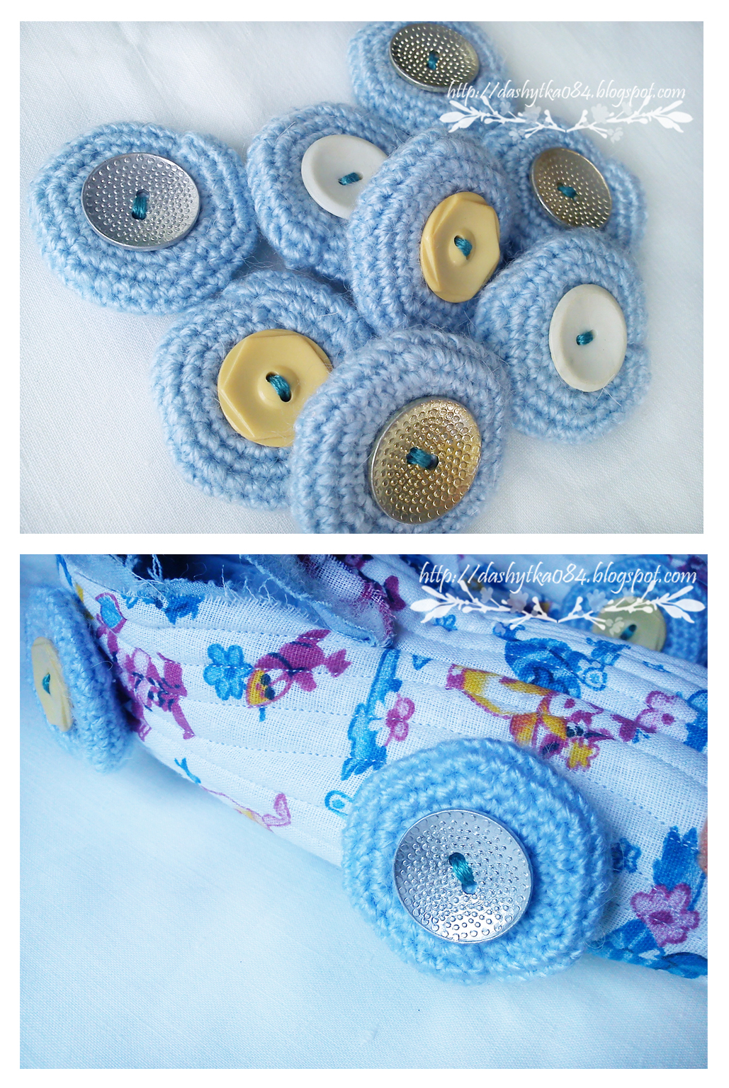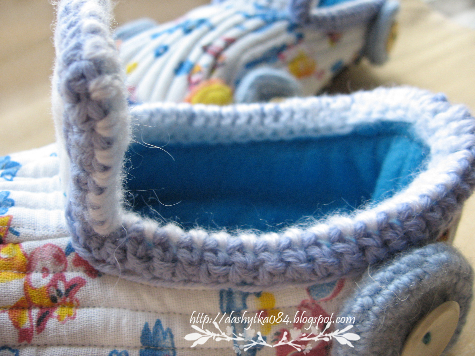 Связала колёса. ЛегкотнЯ! Вяжутся по принципу амигуруми. Первый ряд - 6 столбиков, второй - 12, третий - 18... В каждом ряду по 6 столбиков прибавляем. После шестого ряда (36 столбиков) провязываем ряд без убавлений и прибавок. Сильно широкие колёса делать не стала, чтобы не мешали ходить. Мой ребёнок и так на ровном месте спотыкается (весь в мать!). Так вот, провязали, значит, один ряд без изменений, а дальше пошли убавлять. В том же порядке. Первый ряд - 30 столбиков, второй - 24, третий - 18... Перед предпоследним рядом набиваем очень слабенько синтепоном (ну или чем вы там обычно набиваете). Восьми одинаковых пуговиц у меня не оказалось, поэтому пришлось решить, что так даже интереснее ))) Пришиваем колёсики. Правда, потом мне задние колёса немного мешали, об этом ниже