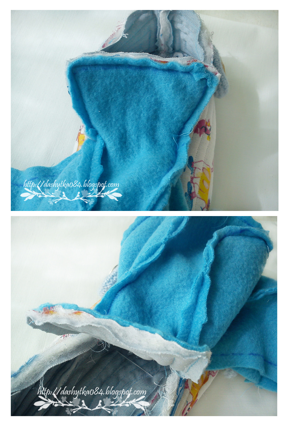 Прострачиваем по кругу, не забывая о лобовом стекле. Я строчила первый круг возле самого краешка, а второй - отступив около 5-7 мм от края. Вот здесь-то мне и помешали задние колёса. Так что можно их и потом пришить. Подождут, ничего с ними не случится. Главное, убрать подальше от детских глаз ) Да, ещё я прихватила подкладку к тапочку в нескольких местах, чтобы не сбивалась в кучу )