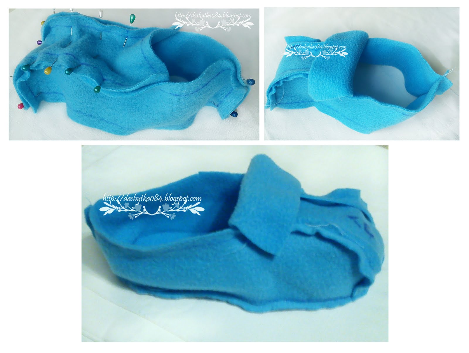 Прострочила две боковинки и верхне-переднюю часть. Потом и с подошвой сострочила. Пошла ловить ногу сына, чтобы померить. Блииииин! Раскройщицей себя возомнила! Нога-то не лезет! Ладно, по пять сантиметров с каждой стороны отпорю, потом придумаю что-нибудь...