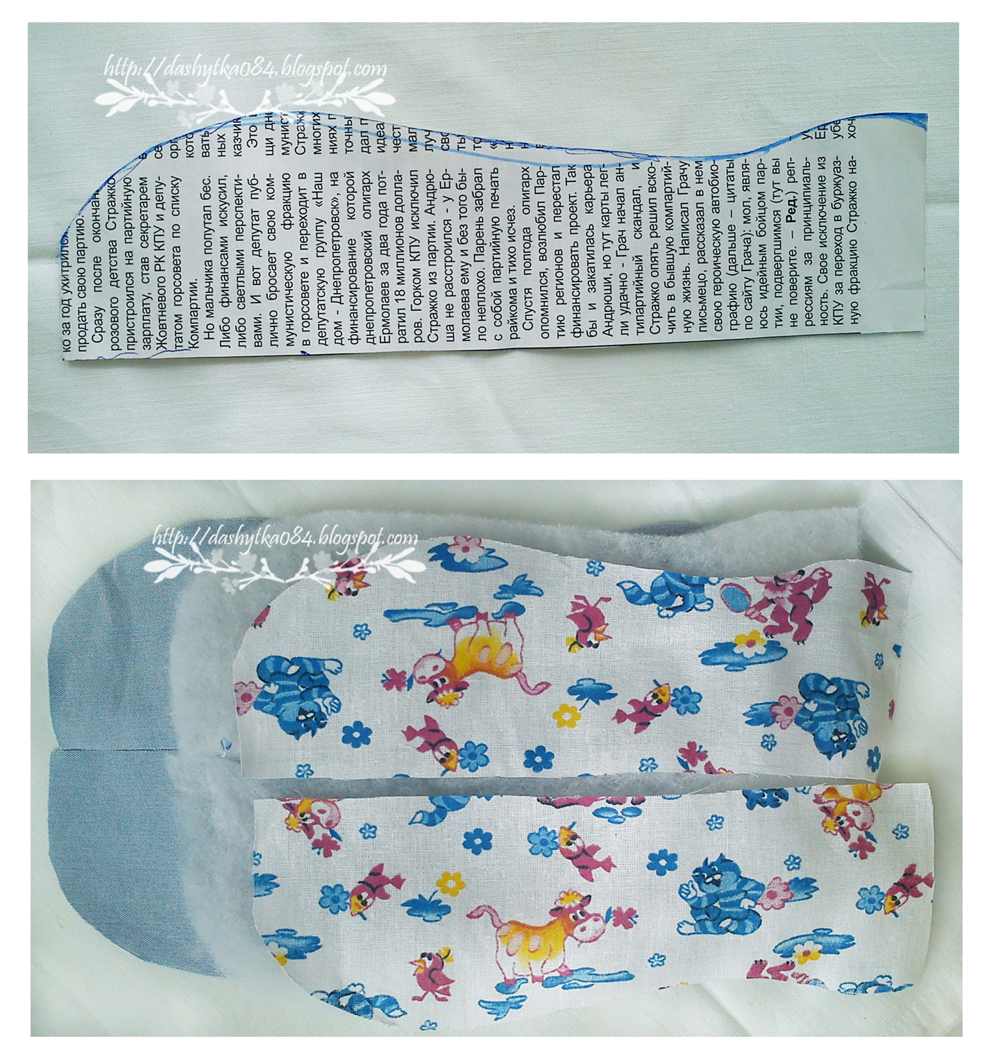 Сколола, простегала. Приколола к подошве, чтобы померить оставшееся расстояние впереди для следующей выкройки. Примерила на ножку сыну, вырезая по пути следующую газетную выкройку.