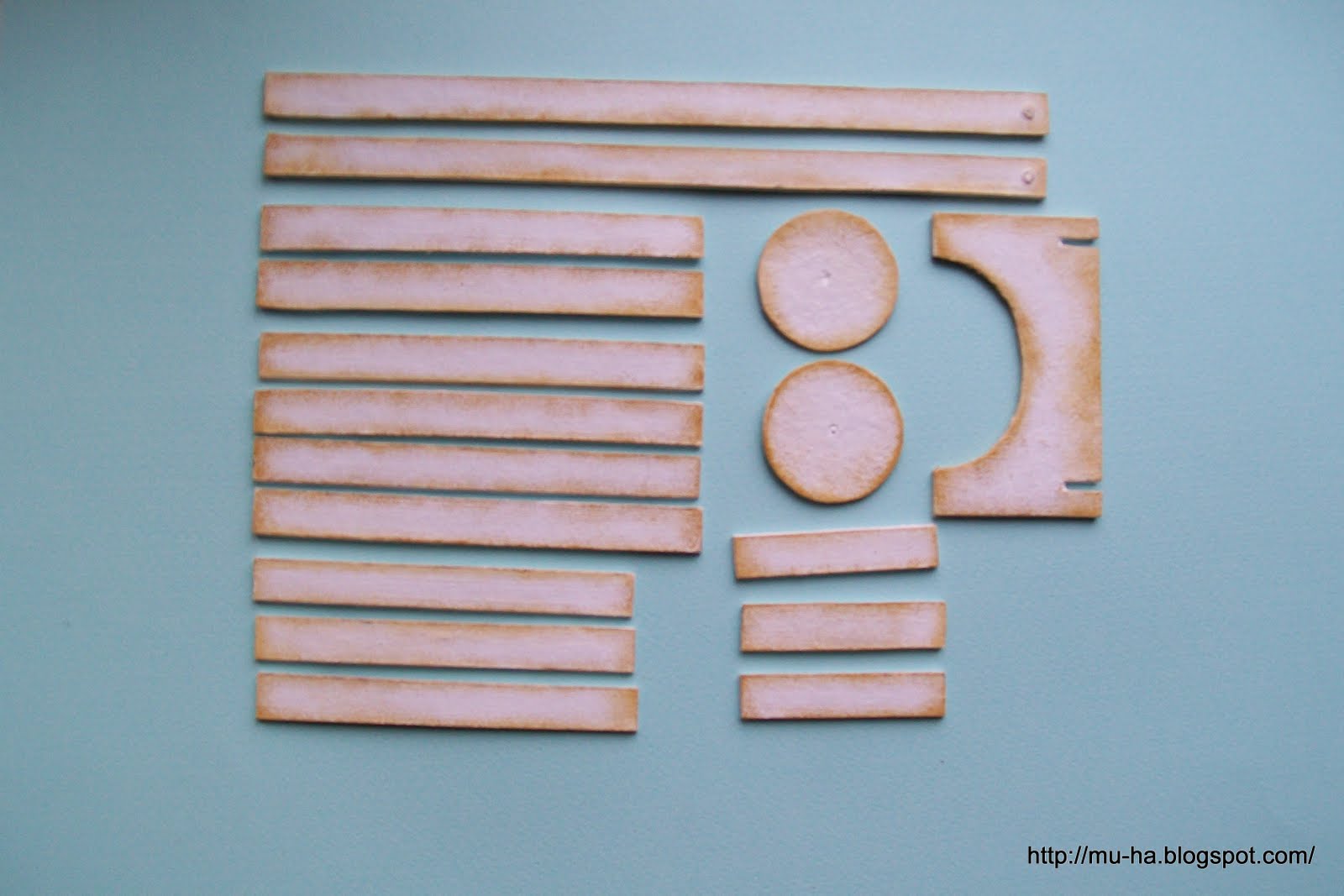 2.Все картонные детали хорошо прокрашиваем белой акриловой краской, лучше пользоваться грубой кистью из щетины чтобы оставалась неровная фвктура имитирующая дерево.