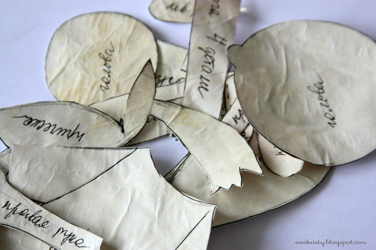 После приклеивания - детали вырезаю. Детали странной наружности (когда непонятно, какая это рука, или что за часть уха) - подписываю: