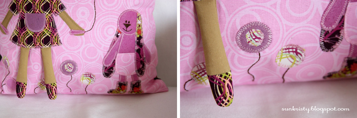 Сначала настрачиваем детали "нижнего слоя": руки, лапы, правое ухо зайца; потом "среднего" - платье (ножки девочки пристрачиваем вместе с платьем), туловище зайца; далее на очереди - головы, левое ухо, прическа, сапожки у зайца и его же трусарди. Иногда я нарушаю очередность (т.к. есть уже практика, не боюсь, что детали сдвинутся). Голову девочки, например, пристрочила сразу, при этом зафиксировав платье.