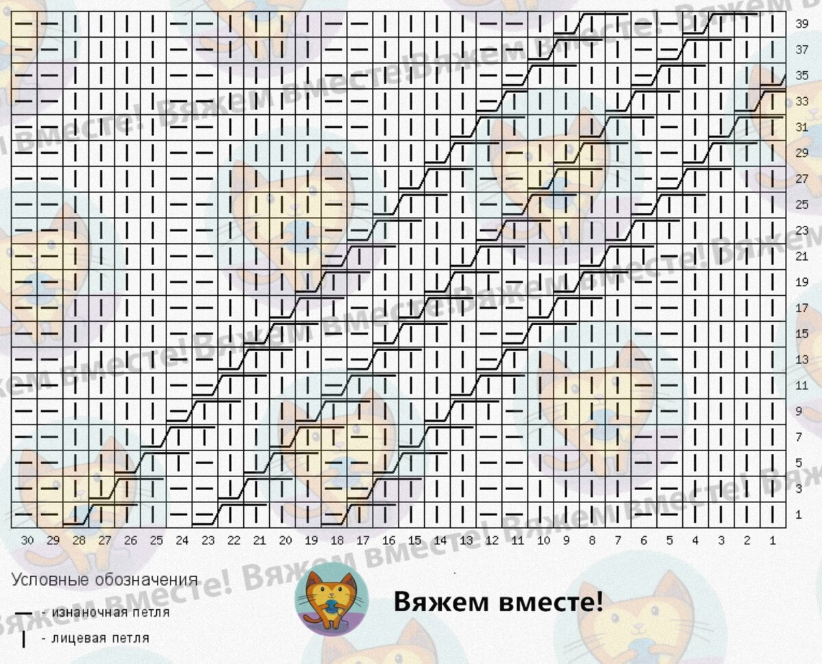 На схеме показан принцип вязания узора. Раппорт узора как по ширине, так и по высоте не имеет границ, но практически ограничивается необходимой шириной полотна.
