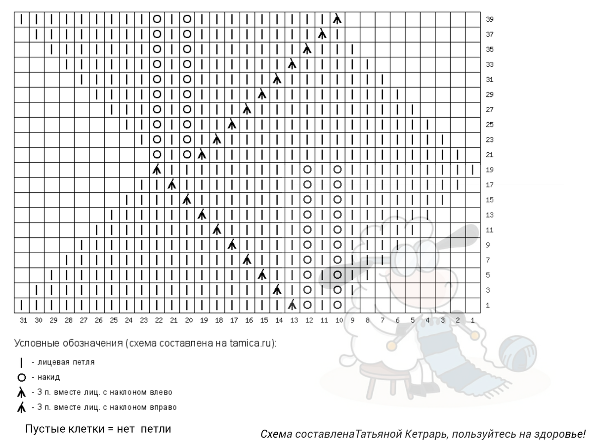 В раппорте узора 22 петли и 40 рядов. Образец в 20-м и 40-м рядах чуть подтягивает, образуя волны. Судя по тому, как выглядит готовое изделие, ВТО приводит полотно в порядок.