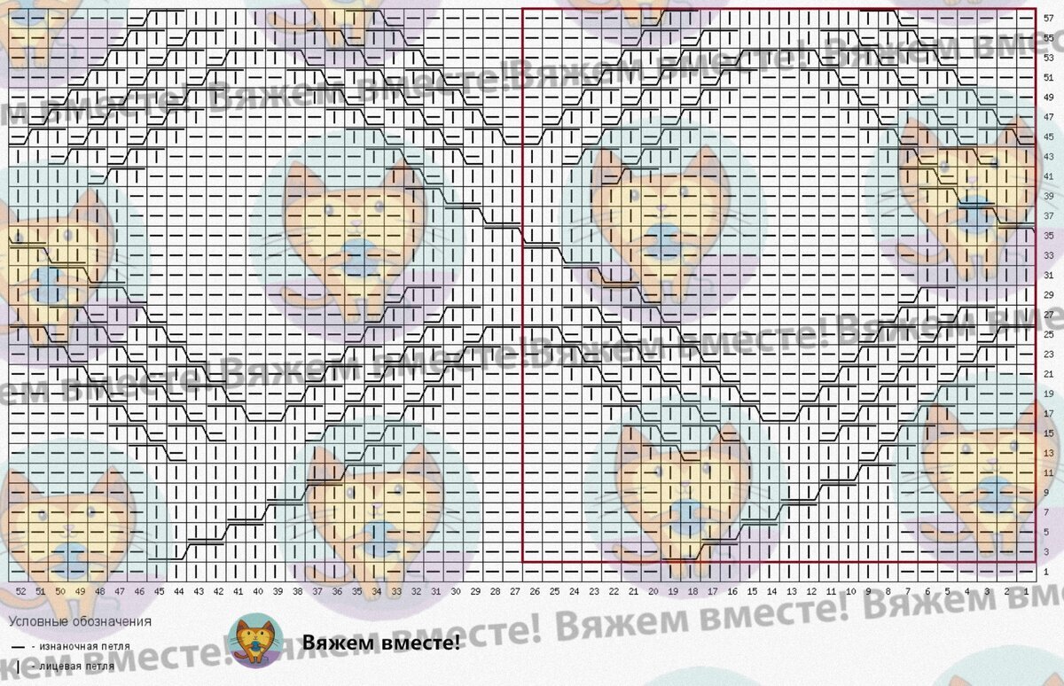 Раппорт узора составляет 26 петель по ширине и 58 рядов по высоте, выделен на схеме красной рамкой.