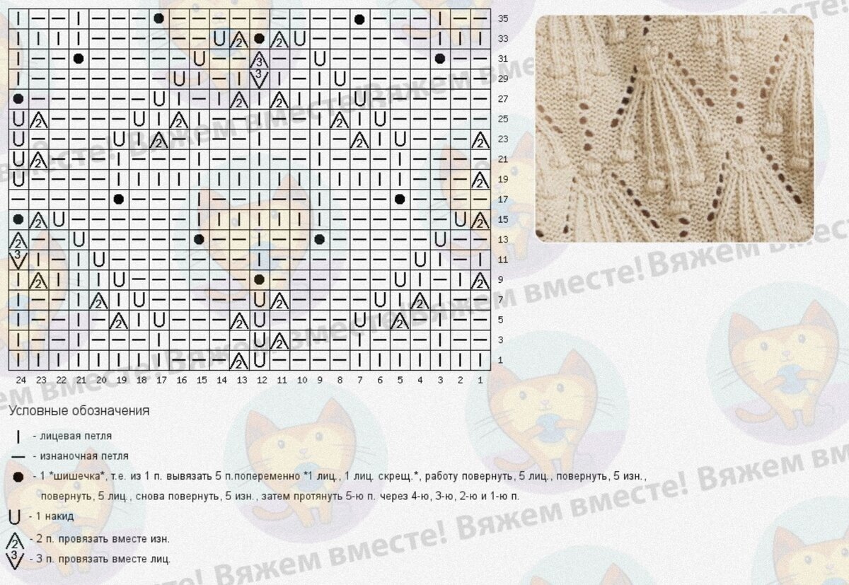 Схема дана для одного раппорта, который составляет 24 петли в ширину и 36 рядов в высоту. Все накиды провязываются лицевыми в изнаночных рядах при поворотном вязании и изнаночными при вязании по кругу.