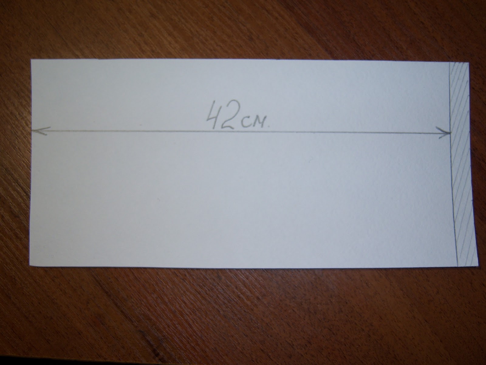 Нацьому етапі головне не забутися добре запам’ятати довжину полоски (яка повиннна би дорівнювати обхвату голови, якщо, звичайно, циліндр має одягатись на голову :-)))). Ось на цьому фото заштриховано місце склеювання полоски і показано довжину (в мене 42 см.) - потрібно з тканини вирізати полоску такої ж довжини + 1мм.(зверніть увагу - саме міліметр, а не більше!)+ припуски на шви.