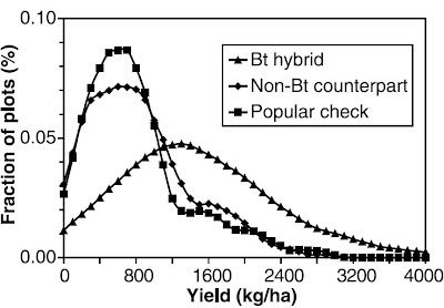 Однако более значительные выгоды связаны с преимуществами в урожайности. Средняя урожайность bt-гибридов превышает не-bt копии и контрольную группу на 80 и 87% соответственно [15]. Функции плотности на рис. 1 показывают, что всё распределение урожайности заметно сдвинуто вправо. Сходство кривых не-bt и контрольной группы показывает, что общий эффект зародышевой плазмы незначителен. Повышение урожайности непосредственно связано с геном Bt. Распространённость коробочного червя в Индии была особенно высокой в 2001 году. Тем не менее, предыдущие испытания, проведённые в меньшем числе мест, но с тем же дизайном эксперимента, показали значительные преимущества в урожайности и в предыдущих сезонах тоже. За 4-летний период с 1998 по 2001 год, bt-гибриды показали в среднем преимущество в 60% [16].