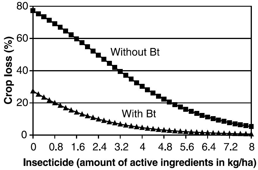 Рис. 2. Связь между использованием инсектицидов и потерей урожая с учетом bt-технологии и без. Кривые - прогнозы, основанные на эконометрической оценке логистической damage-control функции. Данные получены на основе 2001 испытания.